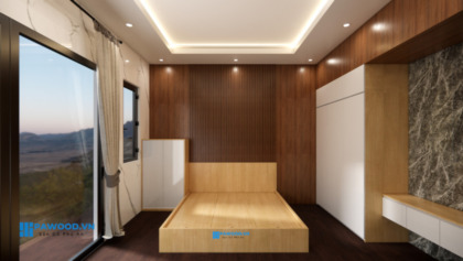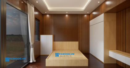 1. Bản vẽ 3D nội thất phòng ngủ sử dụng tấm ốp tường giả gỗ: