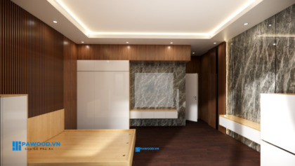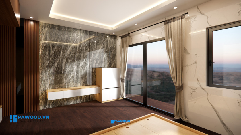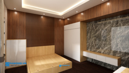 2. Bản vẽ 3D nội thất phòng ngủ sử dụng PVC vân đá: