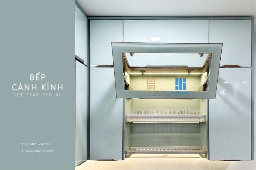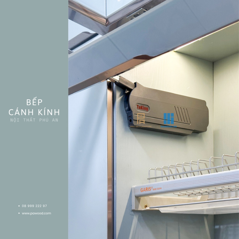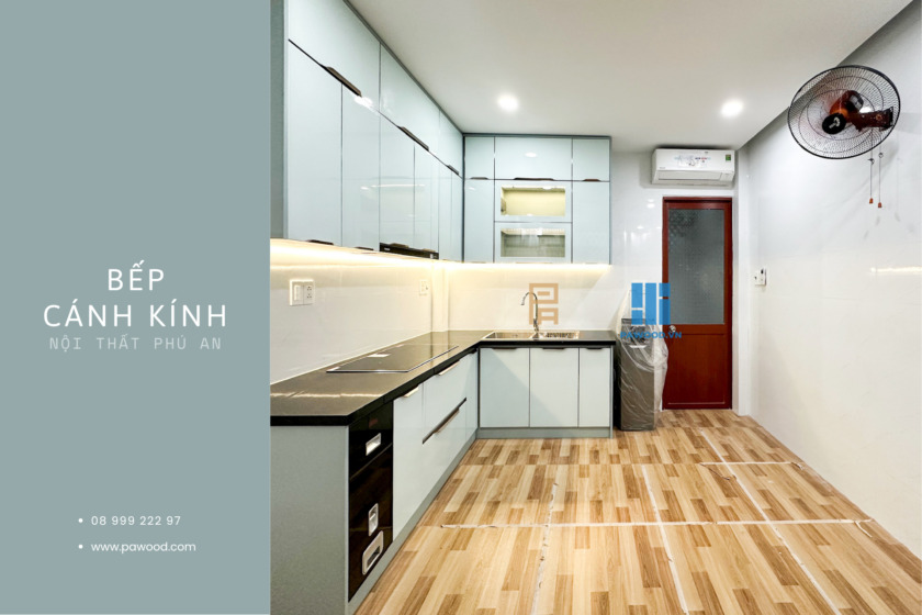 Bếp cánh kính siêu bóng với màu xanh pastel trẻ trung dẫn đầu xu hướng 2025 của nhà Phú An.