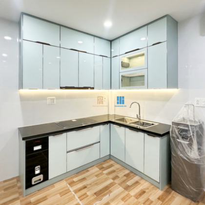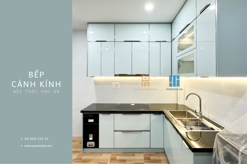 Bếp cánh kính siêu bóng với màu xanh pastel trẻ trung dẫn đầu xu hướng 2025 của nhà Phú An.