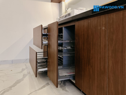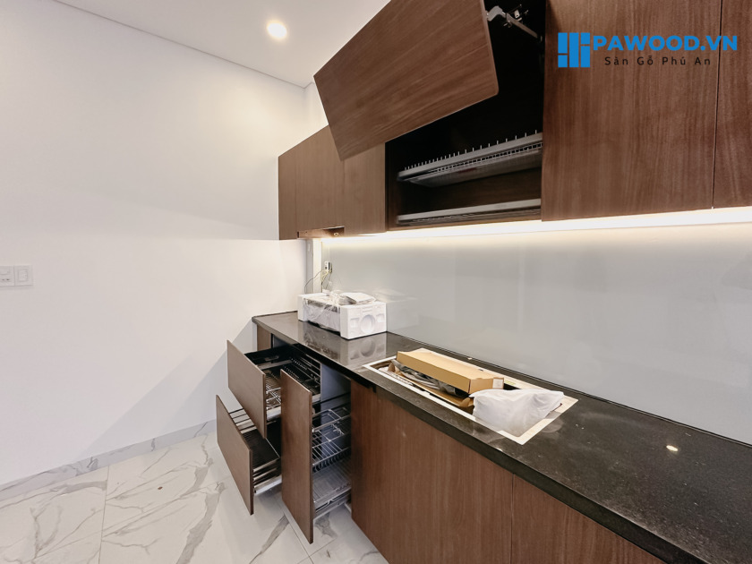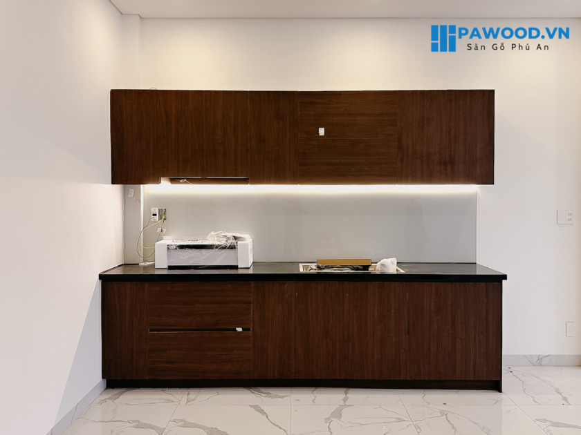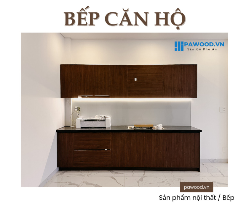 Sản phẩm bếp căn hộ được thiết kế gọn gàng dựa theo mục đích và nhu cầu của mỗi khách hàng. Phú An sử dụng vật liệu nhựa phủ Laminate cho dự án lần này bởi dòng bếp vân gỗ Laminate luôn là dòng sản phẩm thể hiện vân gỗ nổi bật, tinh tế nhất trong các mẫu Film bề mặt. Với bếp nhựa căn hộ, quý khách có thể yên tâm sử dụng trong thời gian dài mà không lo sợ bị thấm nước gây hư hỏng ván.