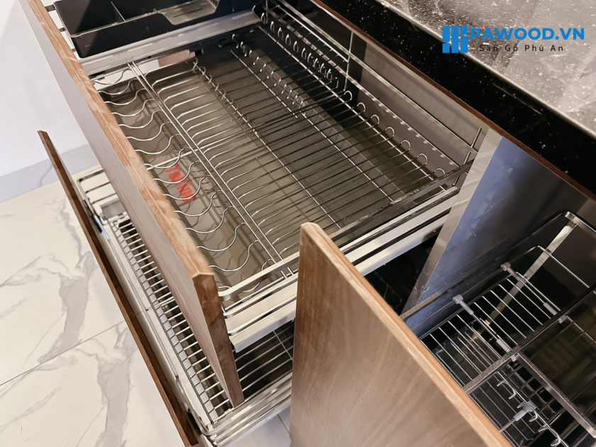 Sản phẩm bếp căn hộ được thiết kế gọn gàng dựa theo mục đích và nhu cầu của mỗi khách hàng. Phú An sử dụng vật liệu nhựa phủ Laminate cho dự án lần này bởi dòng bếp vân gỗ Laminate luôn là dòng sản phẩm thể hiện vân gỗ nổi bật, tinh tế nhất trong các mẫu Film bề mặt. Với bếp nhựa căn hộ, quý khách có thể yên tâm sử dụng trong thời gian dài mà không lo sợ bị thấm nước gây hư hỏng ván.