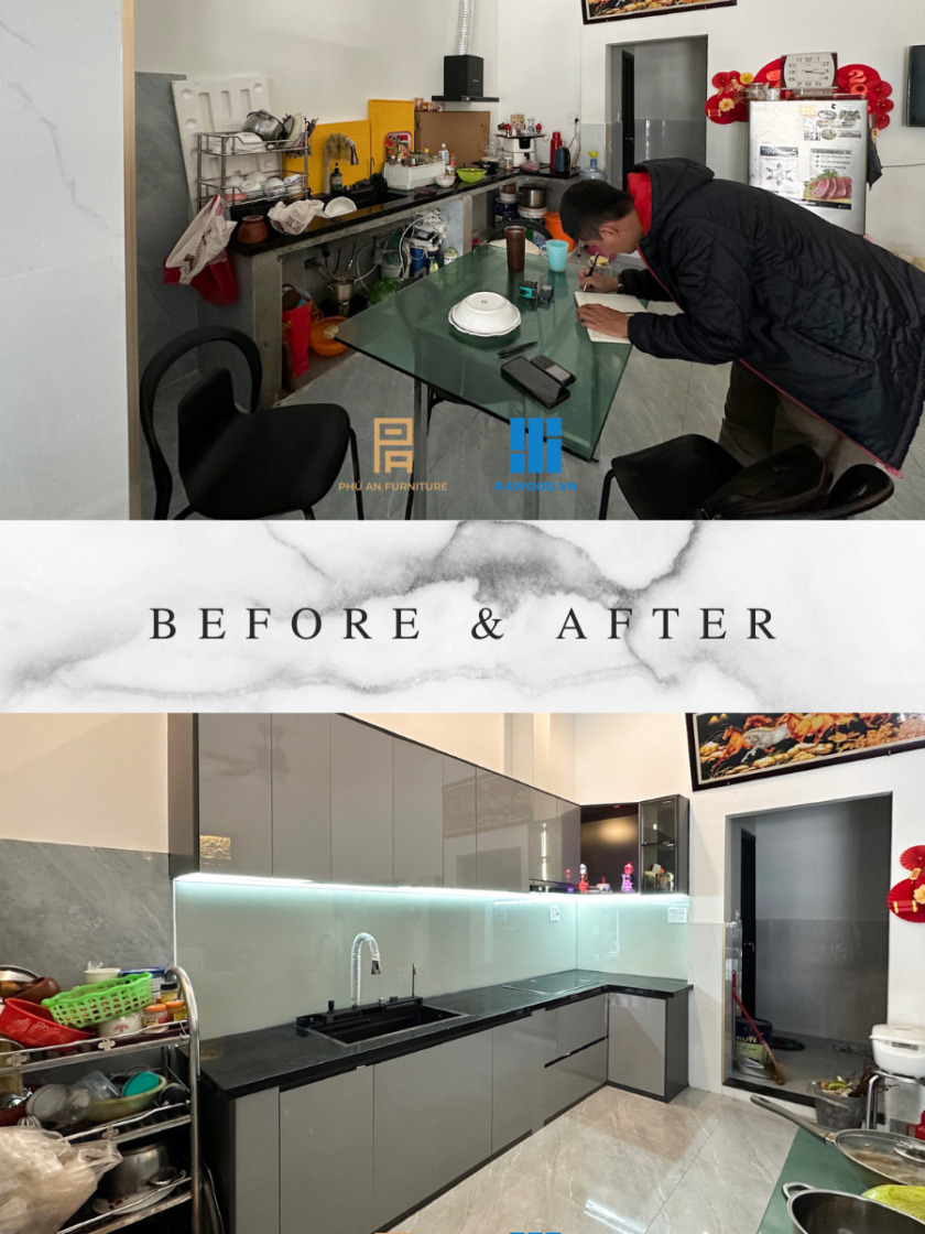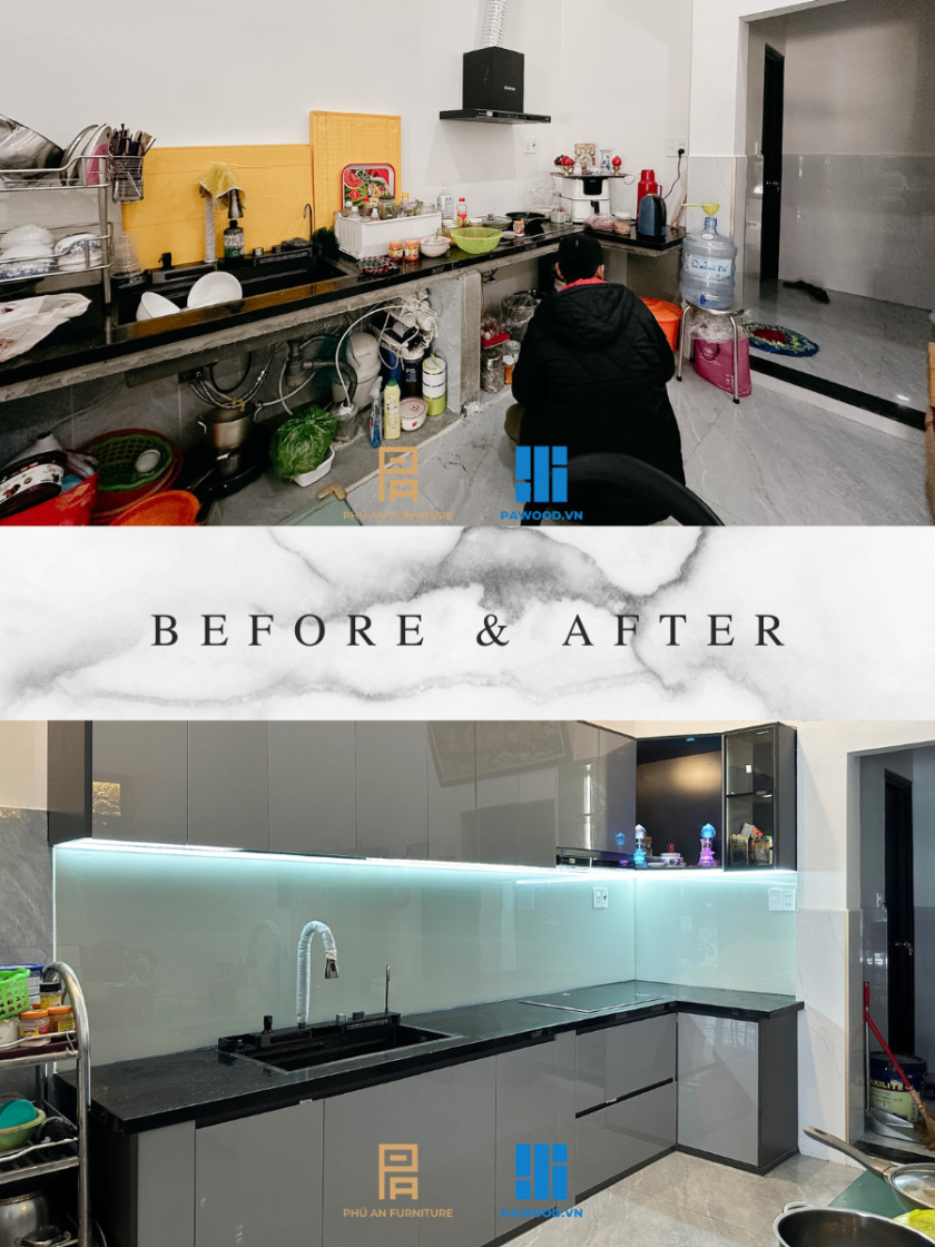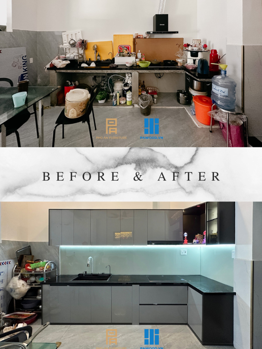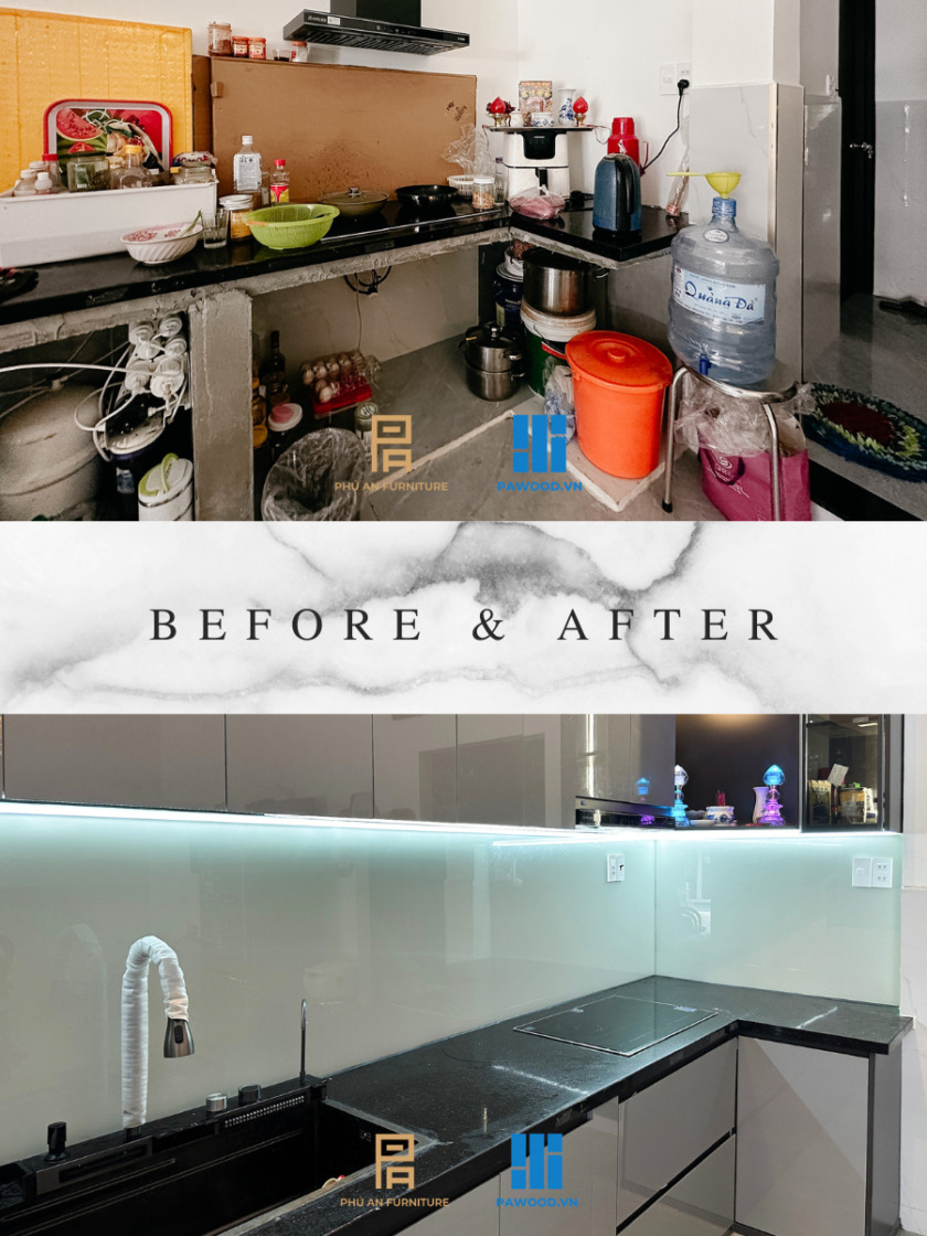 Hình ảnh trước và sau khi thi công cải tạo bếp cũ: