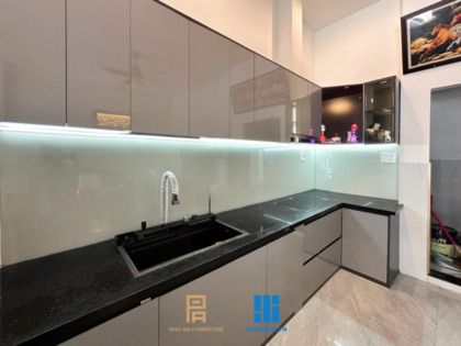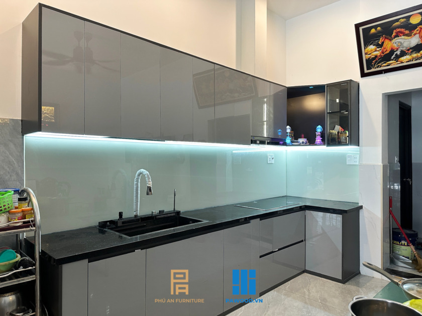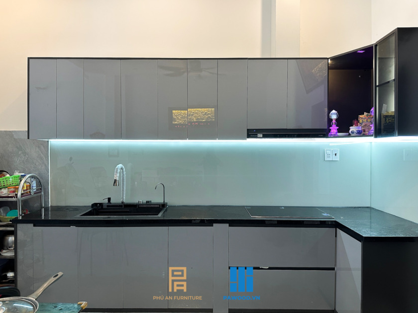 Cánh Acrylic siêu bóng là điểm sáng giá của lần cải tạo bếp cũ này. Với phối màu hiện đại, tone xám đen được Phú An tin tưởng đưa vào thiết kế dự án này. Với tone xám nổi bật bởi vật liệu Acrylic siêu bóng, hệ tủ bếp sẽ là điểm thu hút mọi ánh nhìn trong không gian sinh hoạt chính của gia đình.