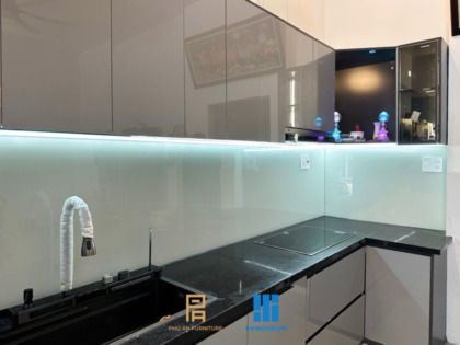 Cánh Acrylic siêu bóng là điểm sáng giá của lần cải tạo bếp cũ này. Với phối màu hiện đại, tone xám đen được Phú An tin tưởng đưa vào thiết kế dự án này. Với tone xám nổi bật bởi vật liệu Acrylic siêu bóng, hệ tủ bếp sẽ là điểm thu hút mọi ánh nhìn trong không gian sinh hoạt chính của gia đình.