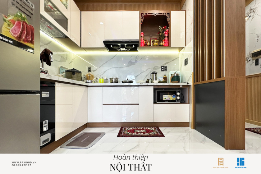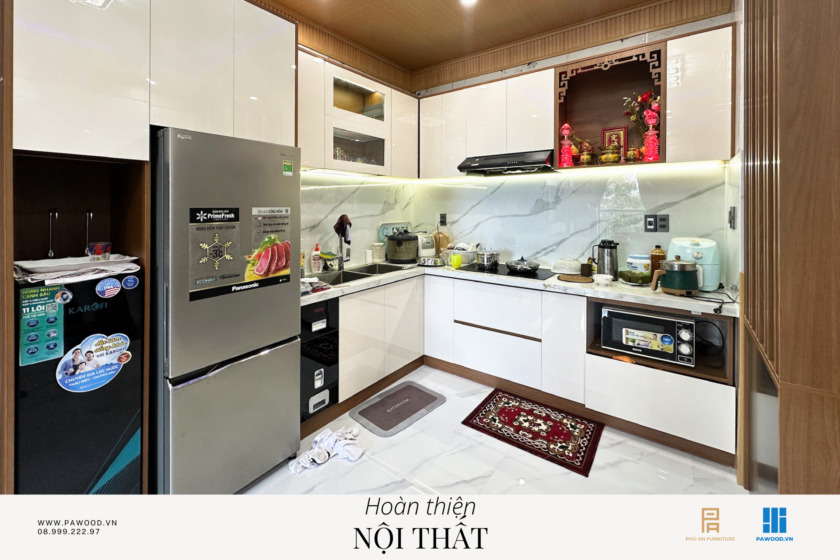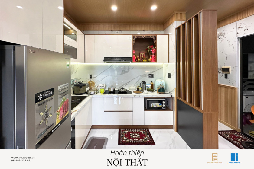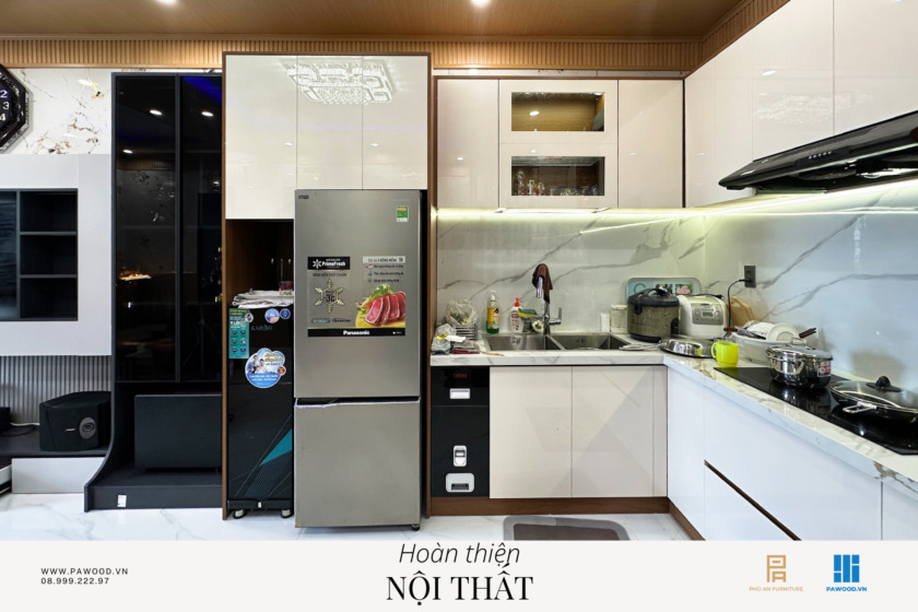 Với thiết kế cách điệu không gian, phần bếp được Phú An lựa chọn phối màu gỗ và trắng là chủ đạo. Vật liệu Acrylic được sử dụng cho cánh bếp, Với đặc tính chống ẩm và có độ bóng cao, cánh Acrylic luôn là điểm nhấn ấn tượng khi chúng ta nhìn vào không gian bếp.