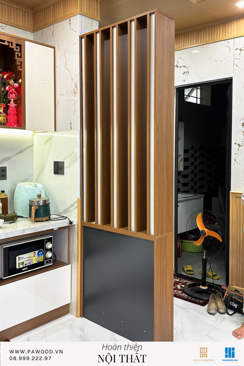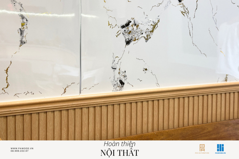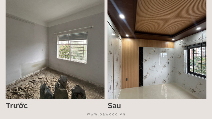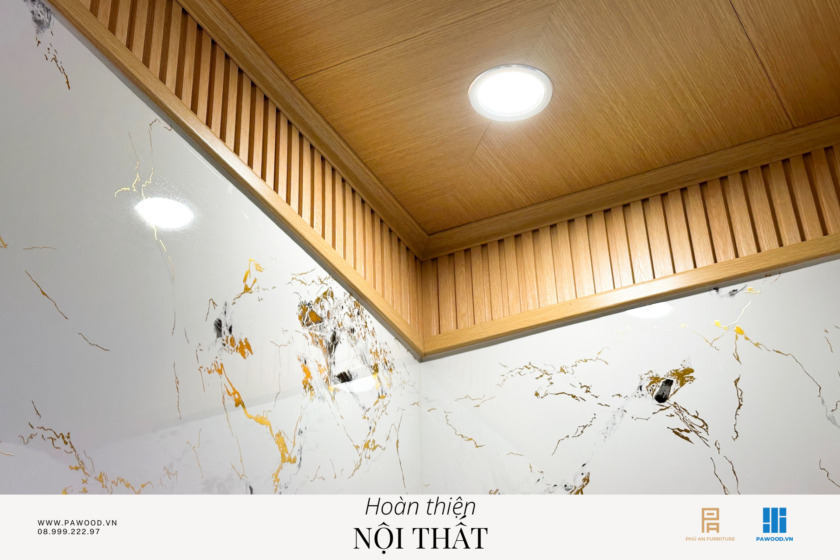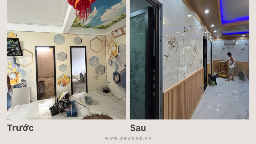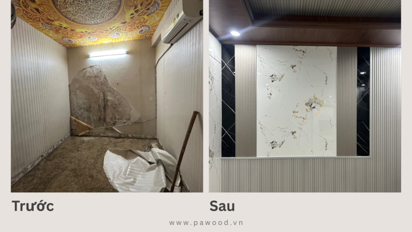 Tường ẩm mốc lâu năm đã xuống cấp gây khó chịu cho gia chủ. Về phần tường, Phú An xử lý bằng phương pháp ốp PVC vân đá kết hợp lam sóng lam ri làm điểm nhấn cho ngôi nhà. Sử dụng khung xương chịu lực bằng đinh thép vào tường, sau đó tấm ốp PVC được cố định vào khung xương bằng keo chuyên dụng tạo ra một khoảng hở cách ẩm cho không gian. nhờ vậy tấm ốp PVC không bị ảnh hưởng bởi hơi ẩm.