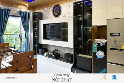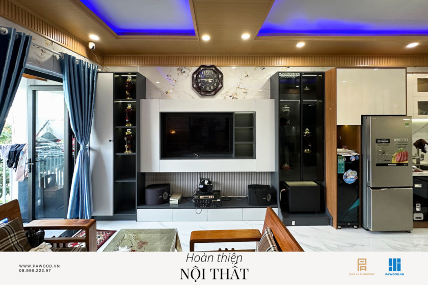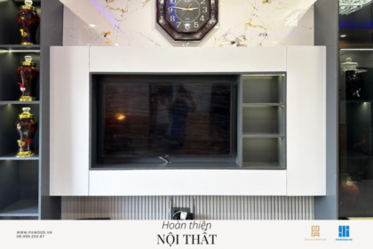 Phần kệ TV được thiết kế hiện đại tách biệt không gian với màu xám trắng làm chủ đạo. Cải tạo chung cư để phần nội thất có độ bền cao, Phú An sử dụng loại gỗ MDF nhập khẩu cao cấp cho ra chất lượng vượt trội về mặt thị giác. Các góc cạnh, đường chỉ được Phú An gia công bằng máy móc với công nghệ tiên tiến nhất đảm bảo đầu ra cực kì sắc nét.