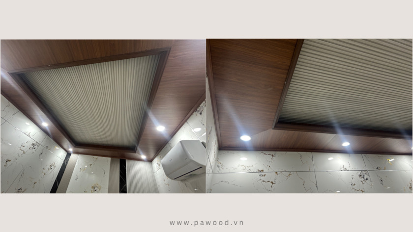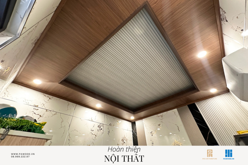 Thiết kế tổng thể màu sắc hài hoà cùng với trần nhựa làm điểm nhấn cho không gian cải tạo chung cư.