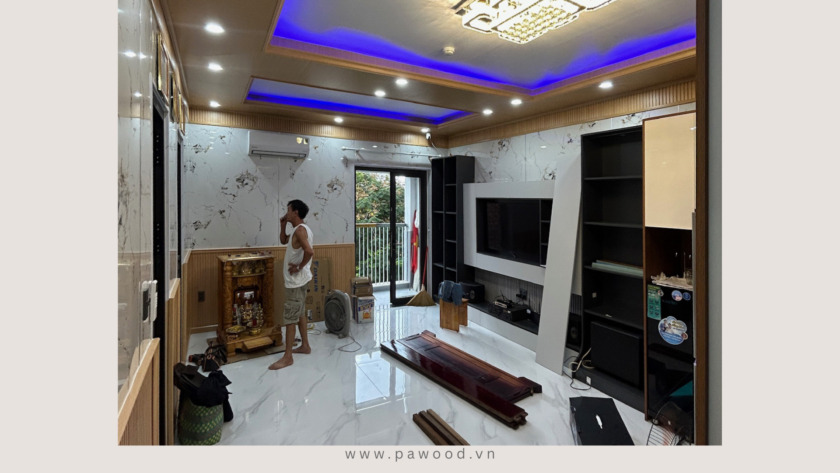 4. Vật liệu: tấm ốp nhựa Nano, Lam sóng, đèn LED, phụ kiện, MDF, nhựa đặc, Acrylic, Laminate, Melamine