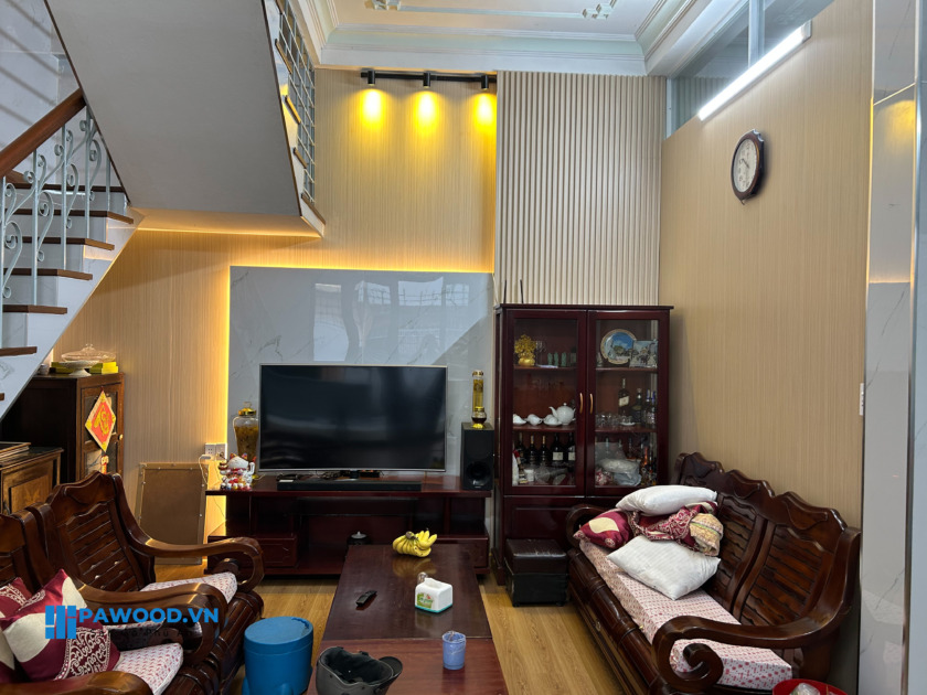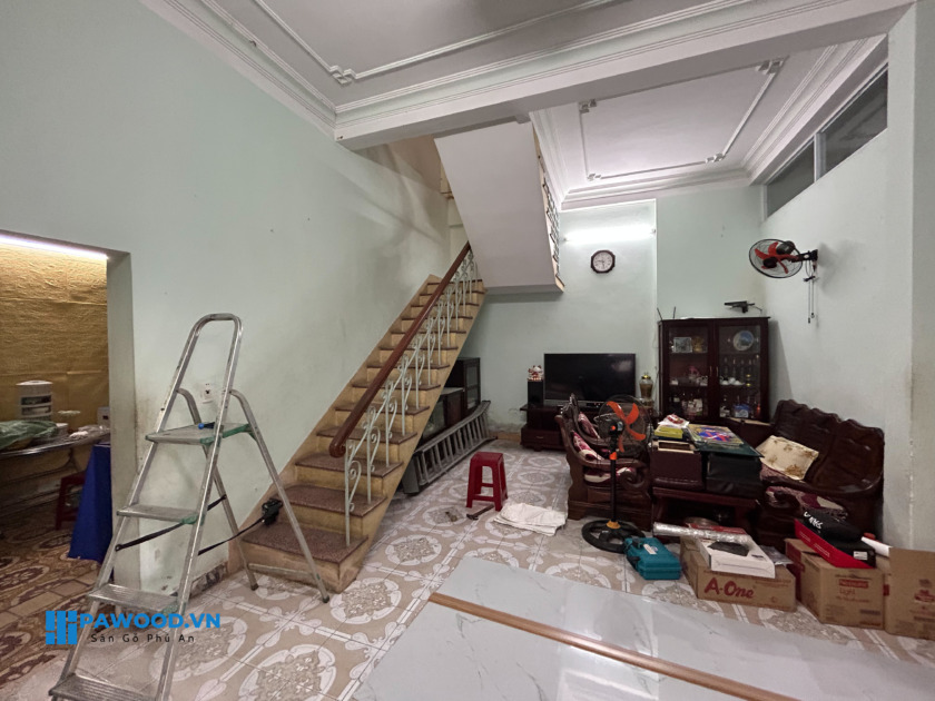 👉🏻 Cải tạo phòng khách cũ, phòng ngủ, không gian sinh hoạt chung của gia đình sau khi xuống cấp tròng trọng sau thời gian dài sử dụng. Phú An sử dụng tấm ốp nhựa để cải tạo cho gia đình – giải pháp tối ưu về chi phí nhưng vẫn giữ được độ thẩm mĩ, độ bền lâu dài cho quý khách hàng. Để cải tạo phòng khách cũ cùng với tấm ốp, Phú An sử dụng sàn gỗ công nghiệp ThaiGreen 12mm để tăng thêm sự sang trọng cho ngôi nhà. Phần cầu thang cũng được Phú An phủ một lớp sàn nhựa để tăng độ ma sát, chống trơn trượt cho gia đình trong quá trình sử dụng.