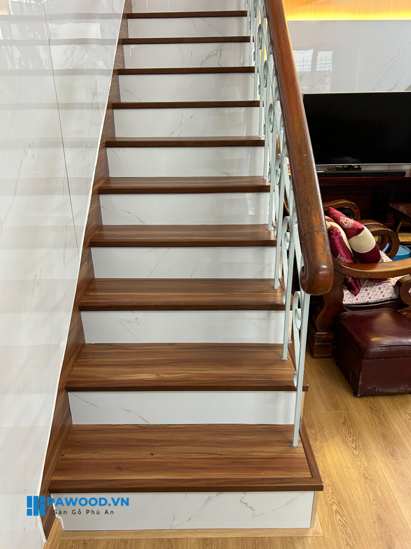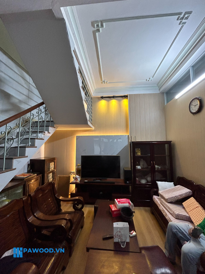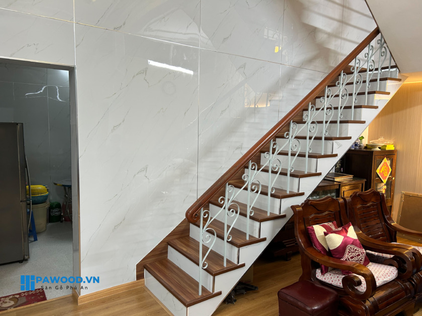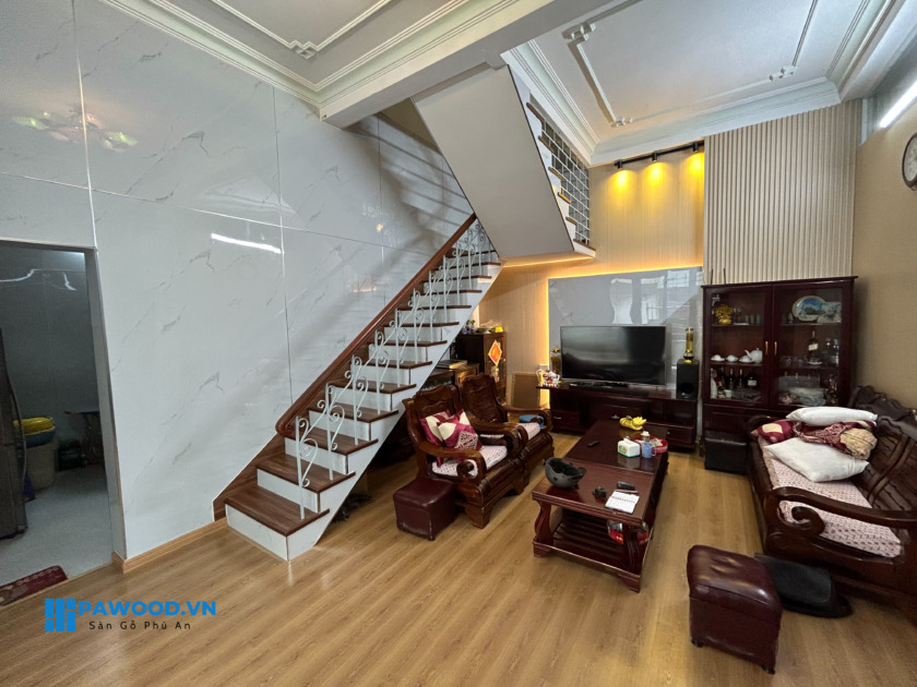 👉🏻 Cải tạo phòng khách cũ, phòng ngủ, không gian sinh hoạt chung của gia đình sau khi xuống cấp tròng trọng sau thời gian dài sử dụng. Phú An sử dụng tấm ốp nhựa để cải tạo cho gia đình – giải pháp tối ưu về chi phí nhưng vẫn giữ được độ thẩm mĩ, độ bền lâu dài cho quý khách hàng. Để cải tạo phòng khách cũ cùng với tấm ốp, Phú An sử dụng sàn gỗ công nghiệp ThaiGreen 12mm để tăng thêm sự sang trọng cho ngôi nhà. Phần cầu thang cũng được Phú An phủ một lớp sàn nhựa để tăng độ ma sát, chống trơn trượt cho gia đình trong quá trình sử dụng.