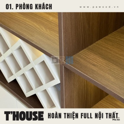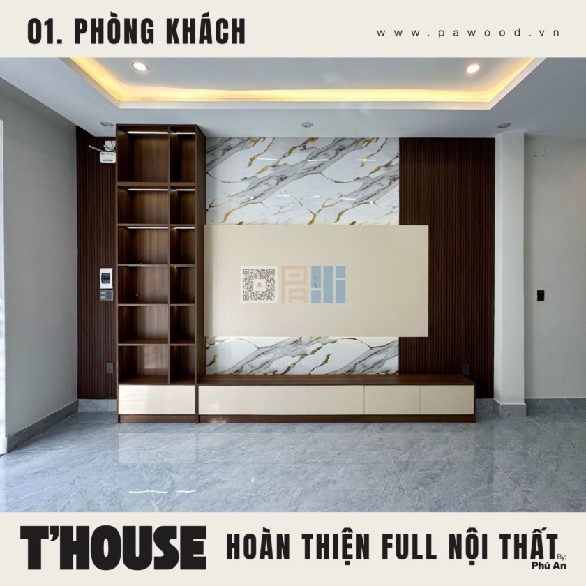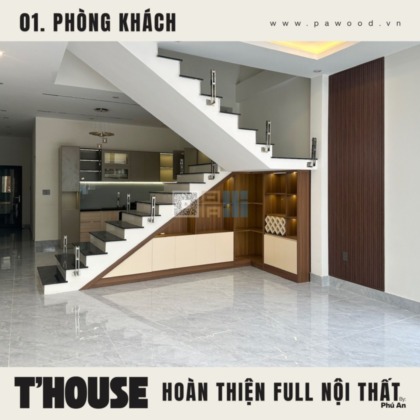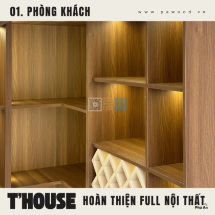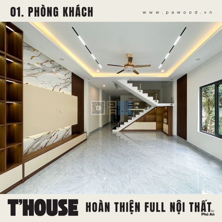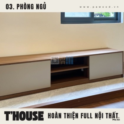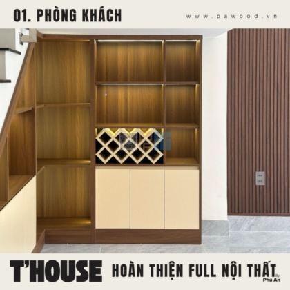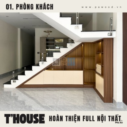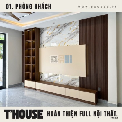 Điểm nhấn của phòng khách không nằm ở sự phô trương mà ở tính ứng dụng. Kệ tivi được thiết kế nhiều ngăn lồng ghép, vừa để đồ tiện lợi, vừa giấu đi những cáp điện lộn xộn. Chất liệu nội thất MDF nhập khẩu giúp bề mặt kệ luôn phẳng phiu, chịu tải tốt. Không gian mở được tận dụng triệt để, tạo luồng không khí lưu thông tốt cho toàn bộ tầng trệt.