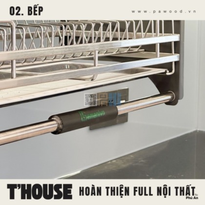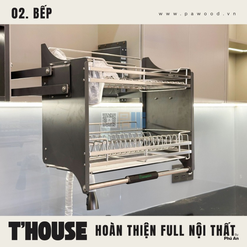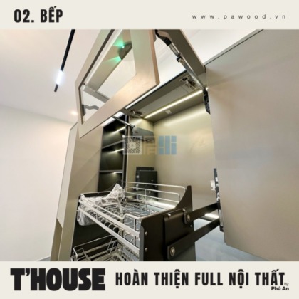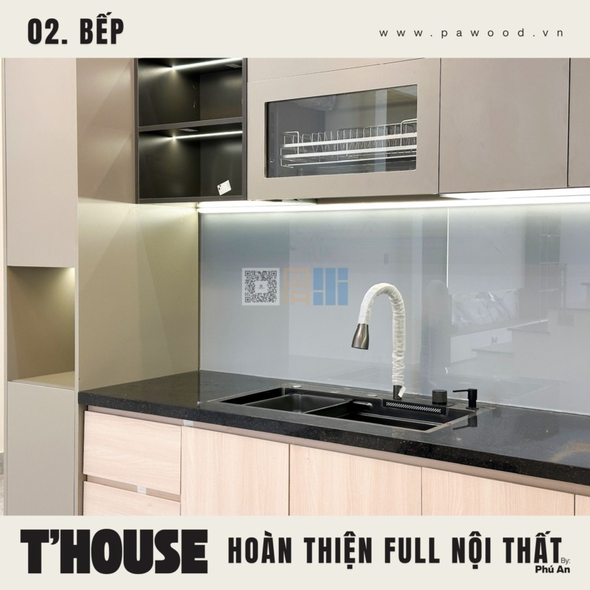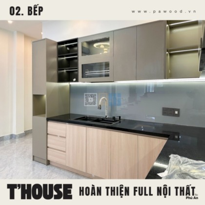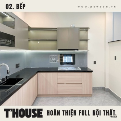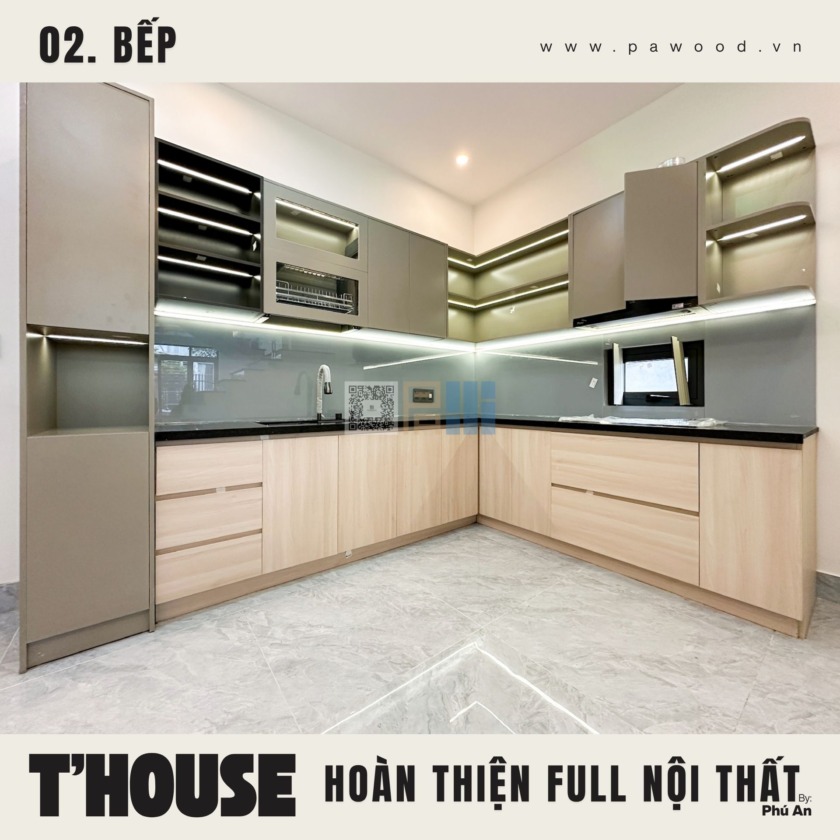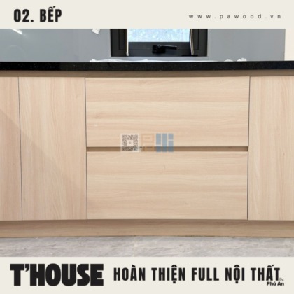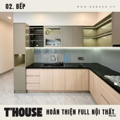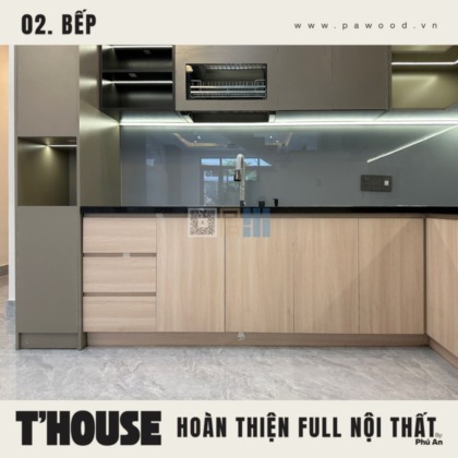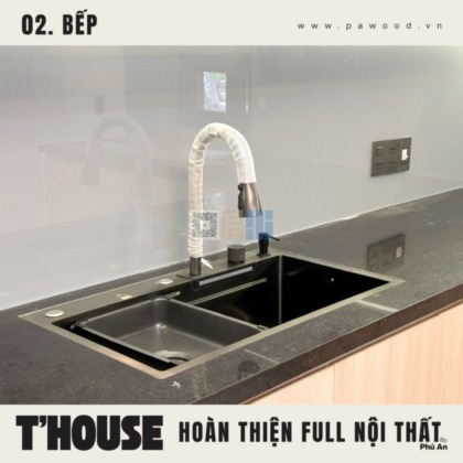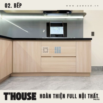 Giải pháp dùng nhựa đặc cho tủ bếp dưới giúp chống nước tuyệt đối, xóa bỏ hoàn toàn nỗi lo bung nở hay mối mọt khi rò rỉ nước. Trong khi đó, hệ tủ bếp trên vẫn sử dụng nội thất MDF nhập khẩu Thái Lan để giữ được vẻ đẹp đồng bộ, ấm cúng. Sự kết hợp thông minh này vừa đảm bảo công năng sử dụng lâu dài, vừa duy trì tính thẩm mỹ cho tổng thể gian bếp nhà bạn.