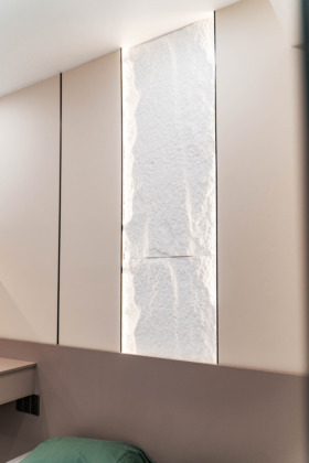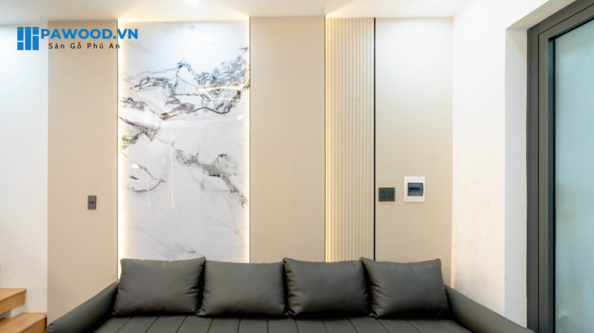 Với phần tường, Phú An sử dụng tấm ốp than tre kết hợp cùng tấm ốp PVC vân đá và tấm ốp lam sóng làm điểm nhấn. Để không gian thêm phần nổi bật, Phú An sử dụng hệ thống đèn led làm điểm nhấn cho căn phòng, tạo thêm điểm sáng giá giúp căn phòng thêm phần sáng sủa, hiện đại.
