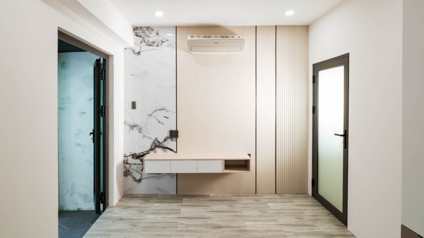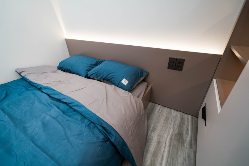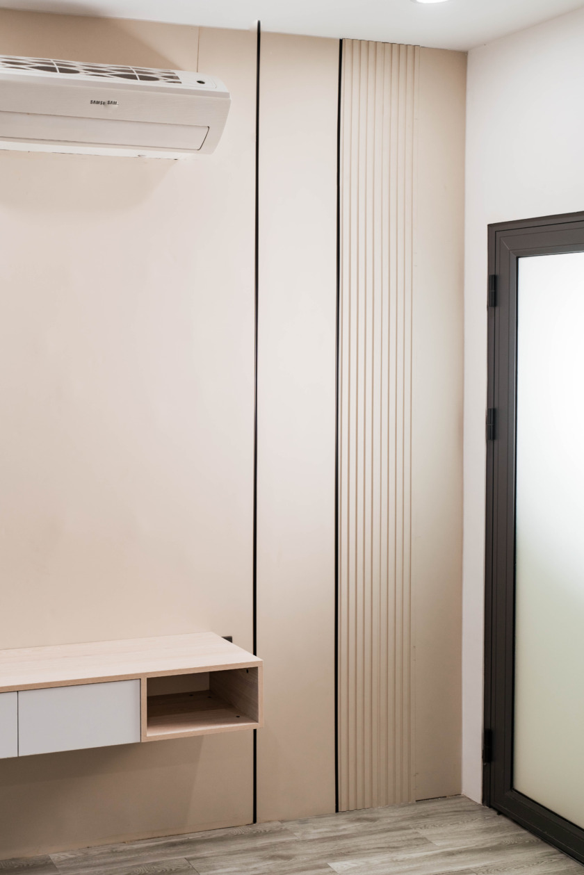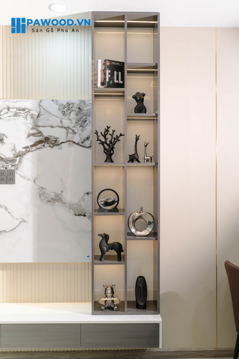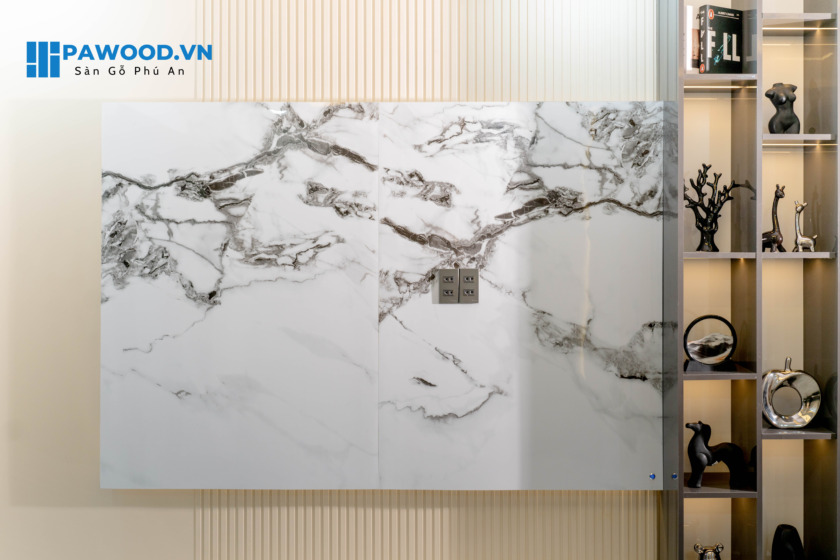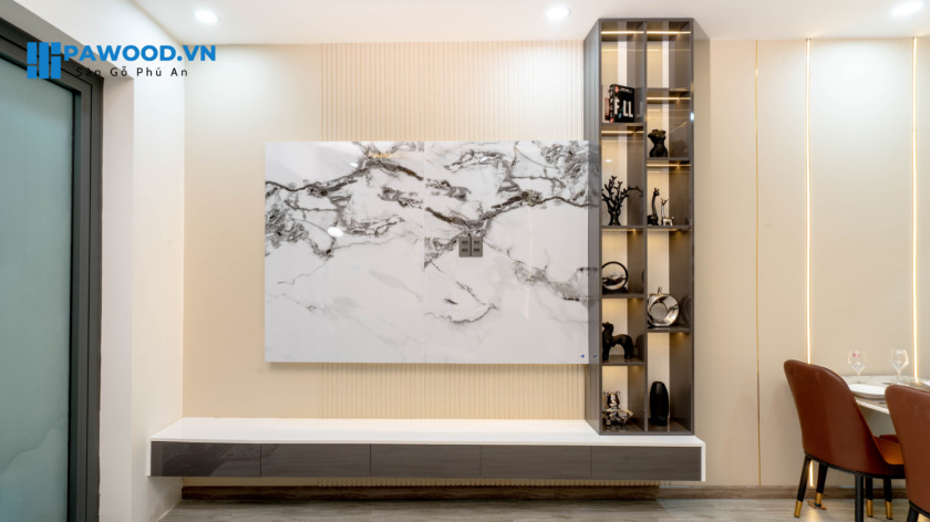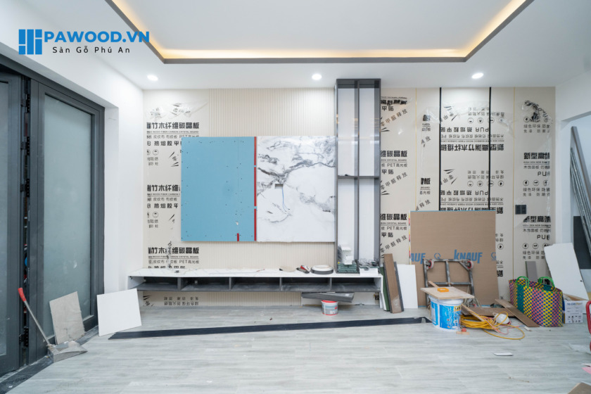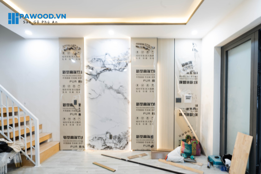 Với phần tường, Phú An sử dụng tấm ốp than tre kết hợp cùng tấm ốp PVC vân đá và tấm ốp lam sóng làm điểm nhấn. Để không gian thêm phần nổi bật, Phú An sử dụng hệ thống đèn led làm điểm nhấn cho căn phòng, tạo thêm điểm sáng giá giúp căn phòng thêm phần sáng sủa, hiện đại.