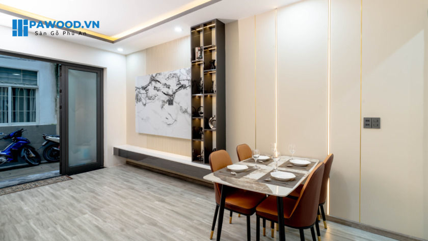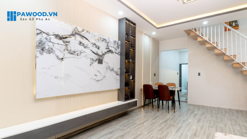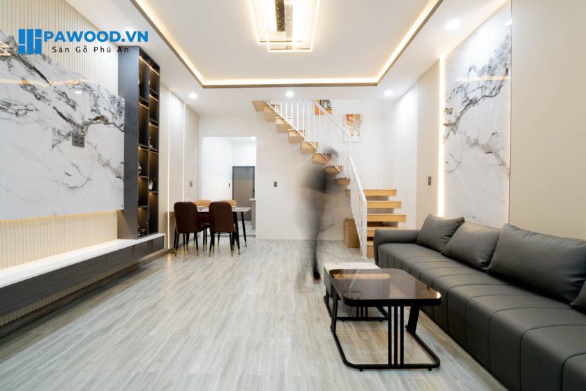 👉🏻 Với căn nhà mang thiết kế hiện đại, gia chủ đã lựa chọn Phú An – thi công nhà phố hiện đại tại Đà Nẵng để gởi gắm ngôi nhà của mình. Phú An sử dụng tấm ốp than tre kết hợp cùng lam sóng, PVC vân đá để không gian thêm phần hài hoà, bắt mắt. Điểm nhấn của căn nhà nằm ở hệ thống đèn led làm nổi bật PVC vân đá, cải thiện đáng kể thẩm mỹ không gian sinh hoạt chung của gia đình.