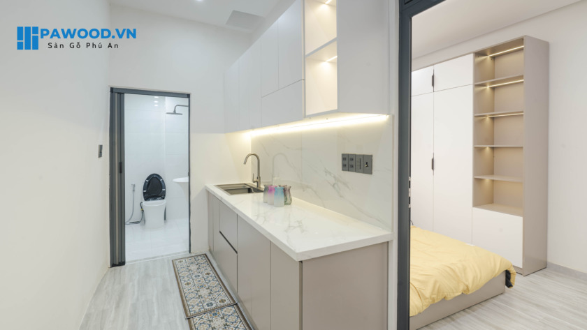 Để cải thiện ánh sáng cho tủ bếp, Phú An trang bị cho bếp 1 dãy đèn led hỗ trợ ánh sáng khi sử dụng, nhờ vào đó mà tạo điểm nhấn cho không gian thêm phần sáng sủa, hiện đại.