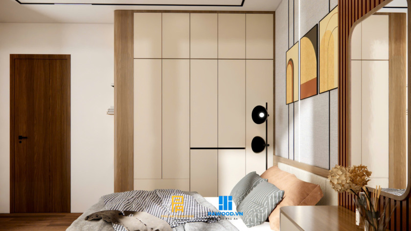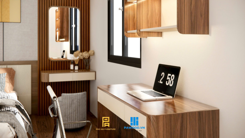 - Chất liệu cao cấp: Sử dụng gỗ công nghiệp phủ Laminate, cánh Acrylic và tấm ốp than tre từ nhà Phú AN, kết hợp các họa tiết để tạo điểm nhấn nghệ thu