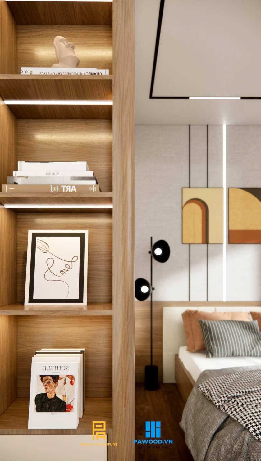 - Chất liệu cao cấp: Sử dụng gỗ công nghiệp phủ Laminate, cánh Acrylic và tấm ốp than tre từ nhà Phú AN, kết hợp các họa tiết để tạo điểm nhấn nghệ thu