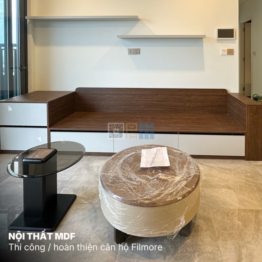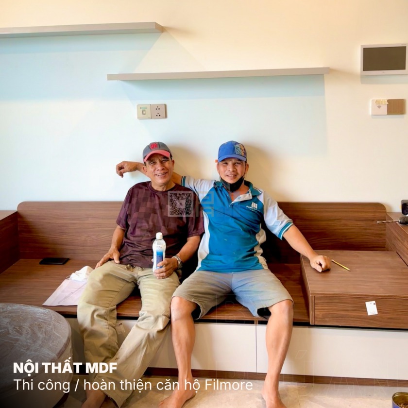 Khám phá dự án hoàn thiện nội thất căn hộ The Filmore Đà Nẵng. Thiết kế hiện đại, tối giản với sofa gỗ công nghiệp, 2 giường ngủ và vách TV treo không chân.