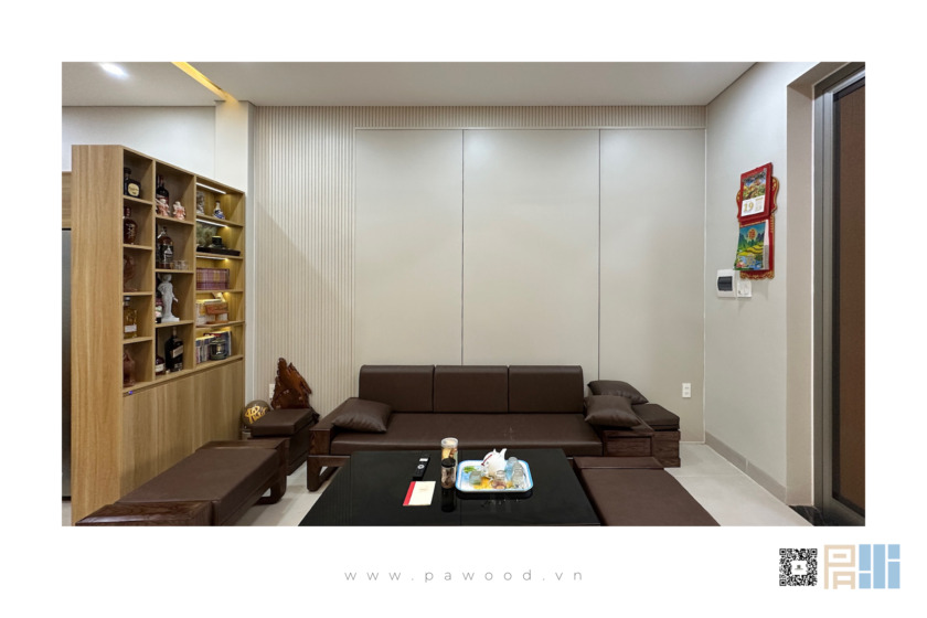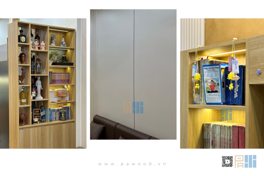 Sự xuất hiện của các thanh lam với bề mặt giả vân vải là một bước đi sáng tạo. Thay vì sử dụng vân gỗ toàn bộ, lớp vân vải mang đến cảm giác mềm mại, tinh tế và giảm bớt vẻ “cứng” của các khối nội thất. Sự tương đồng về hệ màu giữa lam vân vải và gỗ 611 tạo nên một dải màu chuyển tiếp mượt mà, không gây đứt gãy thị giác.