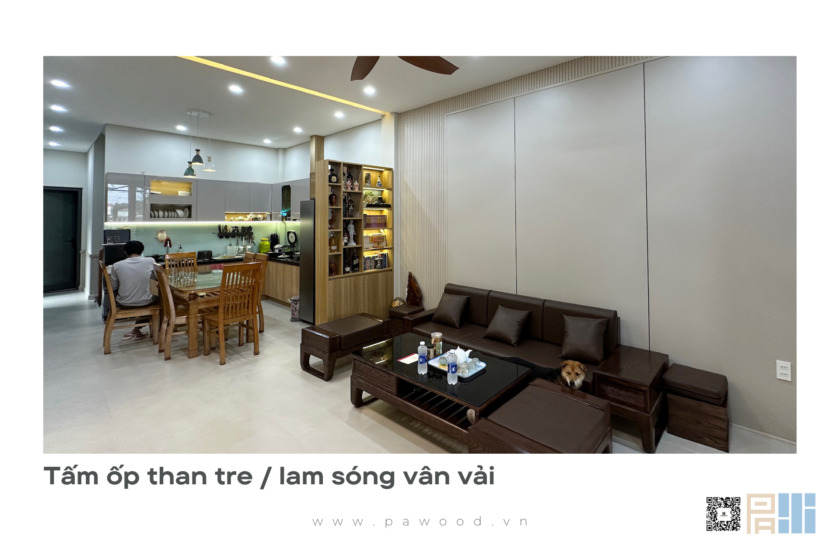 Để tránh sự đơn điệu, việc sử dụng tấm ốp đa năng sợi than tre làm vách ngăn hoặc điểm nhấn sau tivi là một sự lựa chọn thông minh.