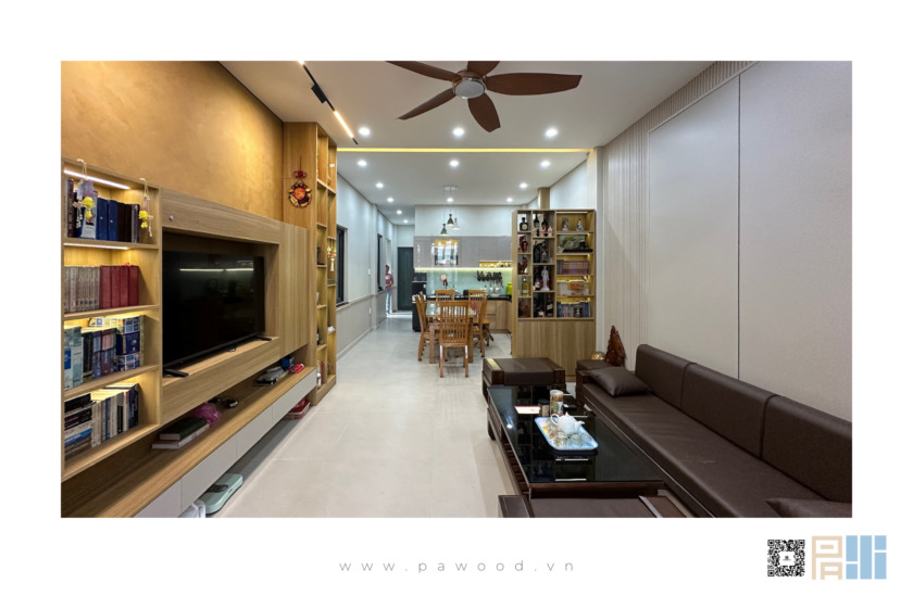 Trong phòng khách, các hệ tủ tivi, bàn trà hay kệ trang trí sử dụng cốt gỗ MDF chống ẩm phủ màu 611 tạo nên sự đồng nhất. Vân gỗ được xử lý tinh xảo, tạo cảm giác chạm chân thực như gỗ tự nhiên, mang lại sự ấm áp cho không gian tiếp khách.