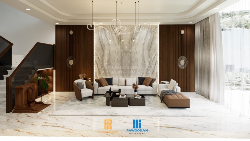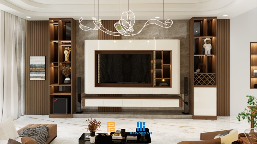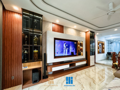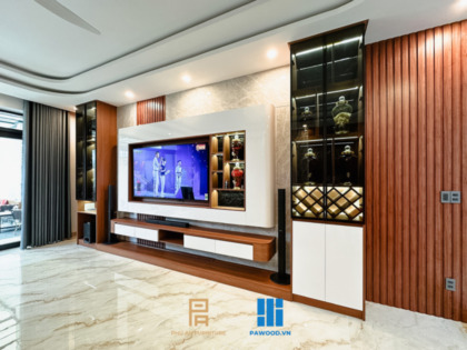 Phòng khách được thiết kế hệ tủ TV kết hợp với tủ rượu trang trí tạo nên hệ thống vách TV cực kì duyên dáng, phối màu cổ điển pha lẫn hiện đại giúp cho không gian thêm phần tinh tế. Điểm nhấn ấn tượng của phòng khách là vách ốp tường tranh đá đặc sắc mà đội ngũ Phú An đã thiết kế. Tấm ốp PVC tranh đá phủ ceramic siêu bóng tạo cảm giác chân thật đến từng chi tiết của bề mặt.