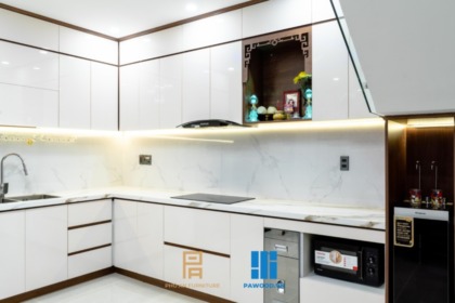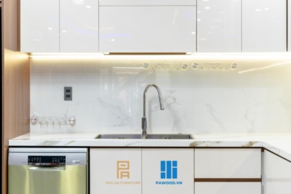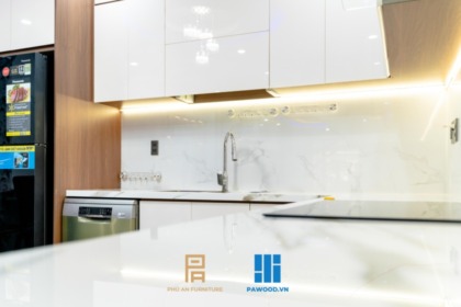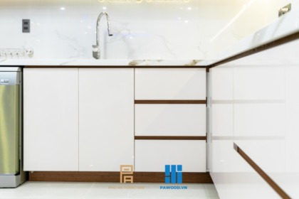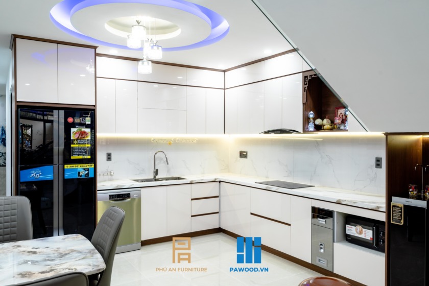 Với các cánh của thệ thống tủ bếp, tủ nội thất, Phú An sử dụng full cánh Acrylic cao cấp chống trầy, siêu bóng tạo nên không gian sinh hoạt sáng sủa và cực kì nịnh mắt gia chủ.
