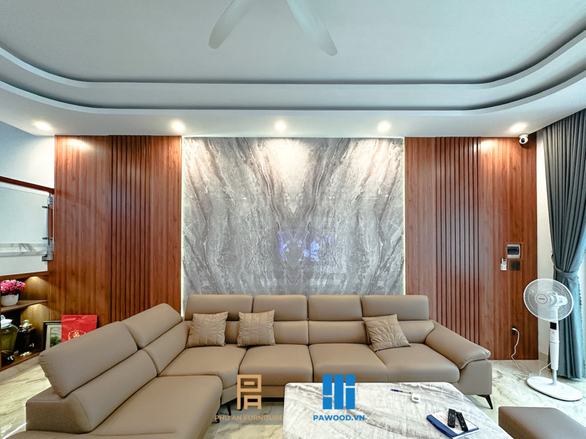 Tất cả sản phẩm nội thất được Phú An sử dụng ván gỗ Plywood cao cấp và nhựa đặc nhập khẩu. Hệ thống phòng khách được kết hợp với tấm ốp tường nhựa Nano và lam sóng Minh Phương cao cấp, PVC vân đá. Tất cả vật liệu được Phú An sử dụng đều đảm bảo độ bền, độ chống chịu nước cực kì vượt trội mang đến cho nội thất nhà phố cao cấp một không gian sống lý tưởng, bền bỉ với gia đình.