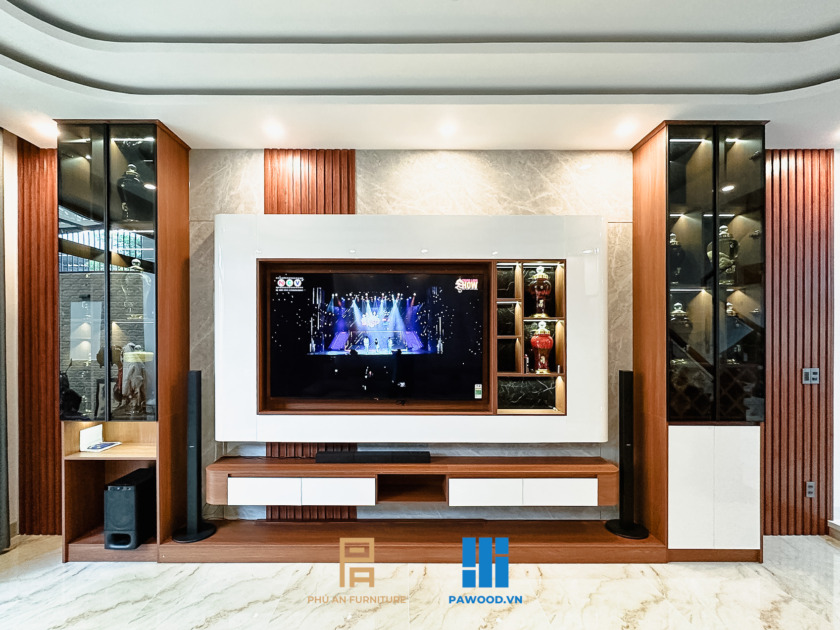 Phòng khách được thiết kế hệ tủ TV kết hợp với tủ rượu trang trí tạo nên hệ thống vách TV cực kì duyên dáng, phối màu cổ điển pha lẫn hiện đại giúp cho không gian thêm phần tinh tế. Điểm nhấn ấn tượng của phòng khách là vách ốp tường tranh đá đặc sắc mà đội ngũ Phú An đã thiết kế. Tấm ốp PVC tranh đá phủ ceramic siêu bóng tạo cảm giác chân thật đến từng chi tiết của bề mặt.