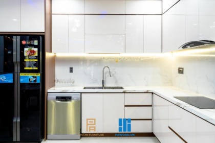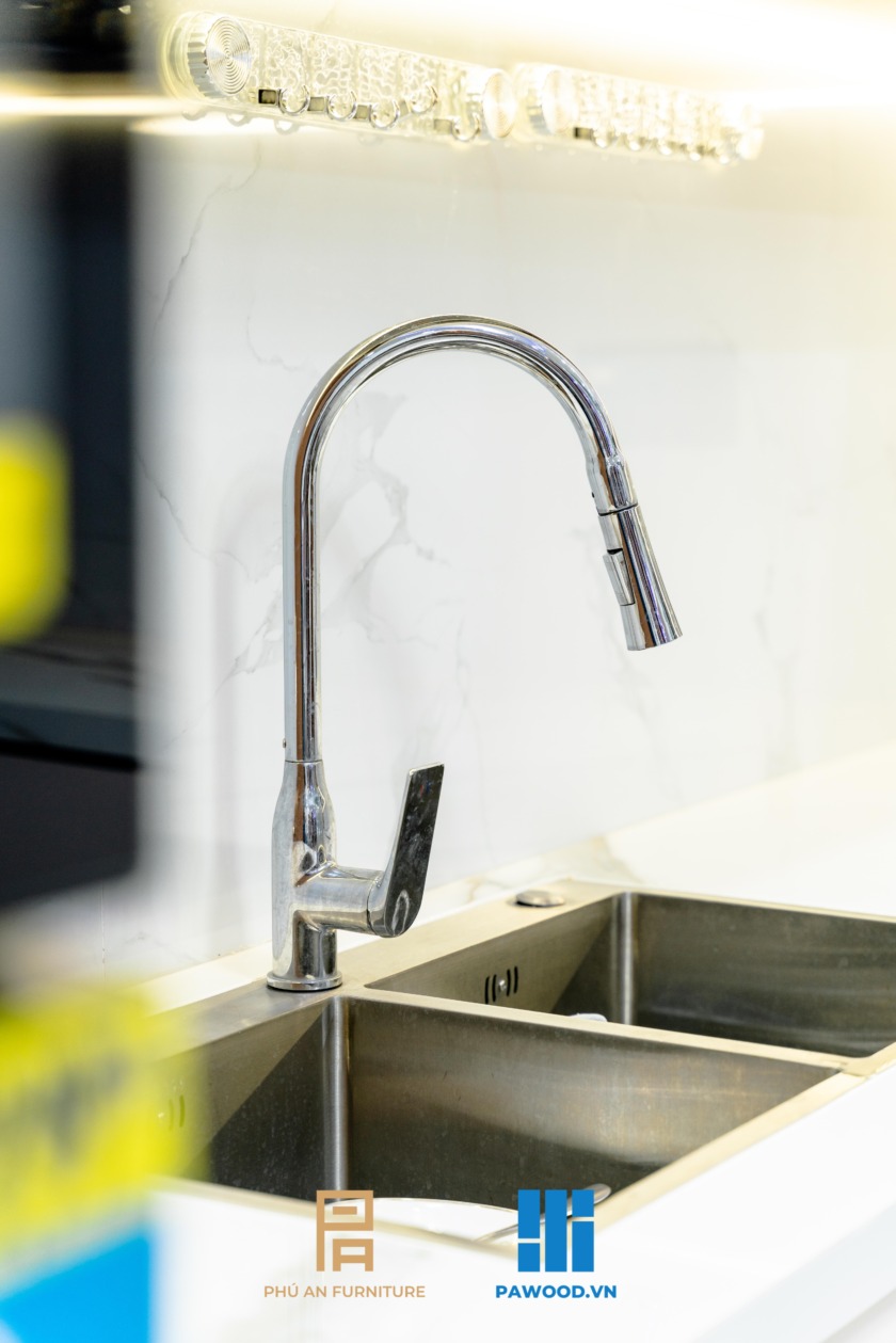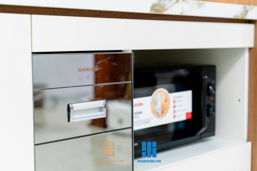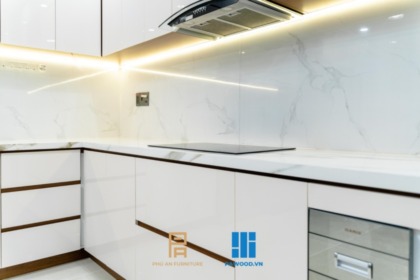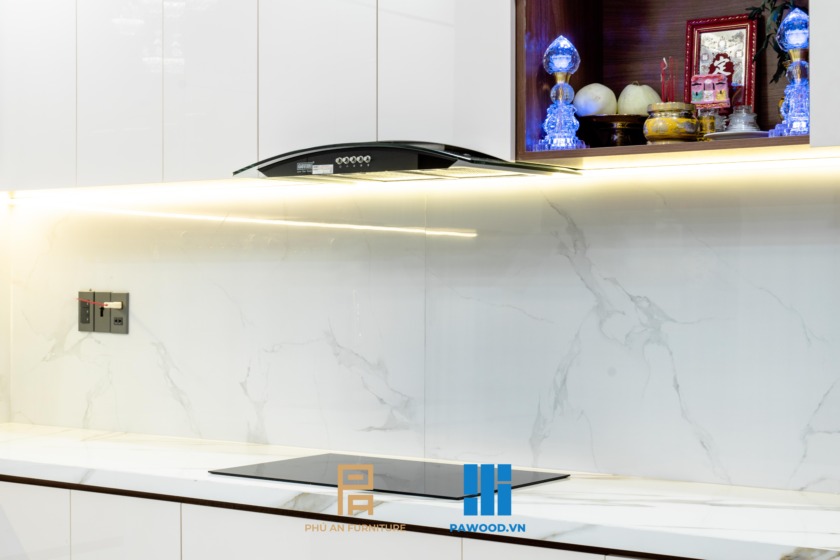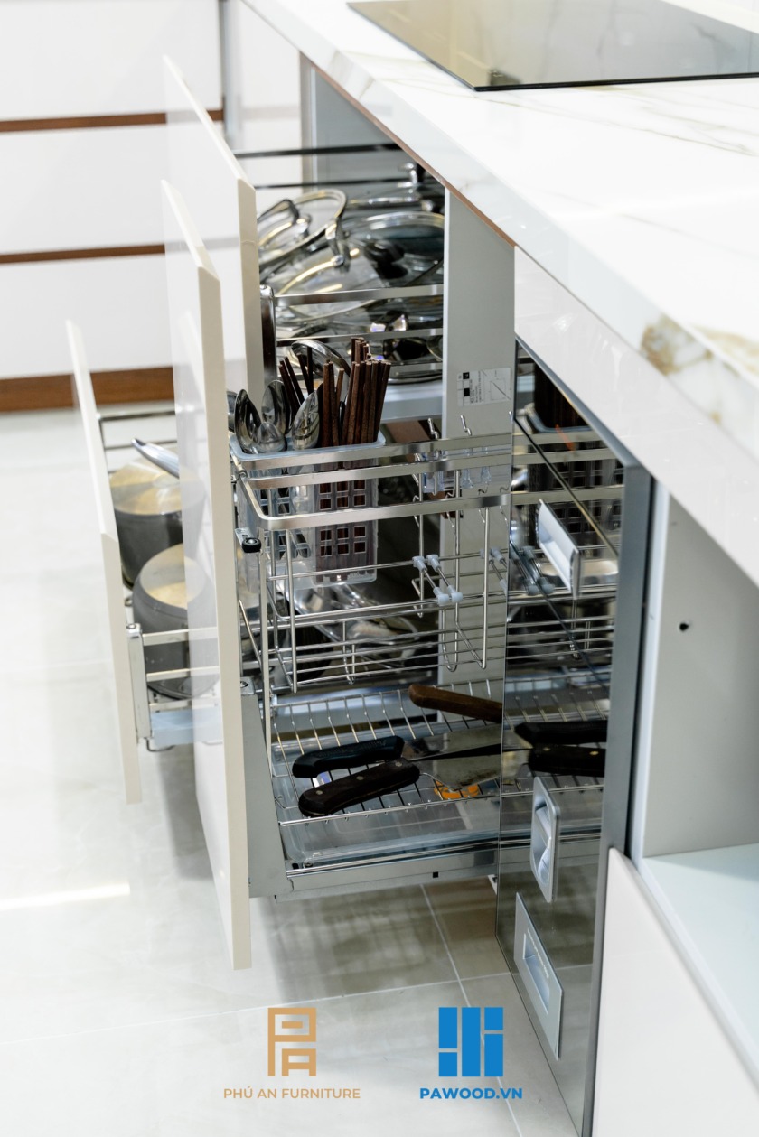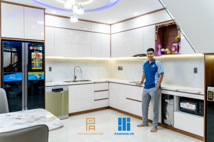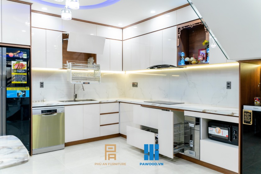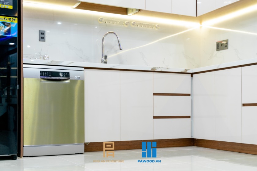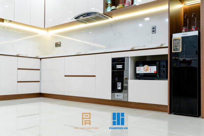 Với các cánh của thệ thống tủ bếp, tủ nội thất, Phú An sử dụng full cánh Acrylic cao cấp chống trầy, siêu bóng tạo nên không gian sinh hoạt sáng sủa và cực kì nịnh mắt gia chủ.