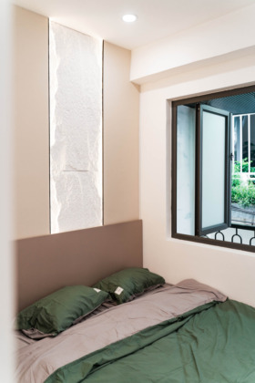 Với phần tường, Phú An sử dụng tấm ốp than tre kết hợp cùng tấm ốp PVC vân đá và tấm ốp lam sóng làm điểm nhấn. Để không gian thêm phần nổi bật, Phú An sử dụng hệ thống đèn led làm điểm nhấn cho căn phòng, tạo thêm điểm sáng giá giúp căn phòng thêm phần sáng sủa, hiện đại.