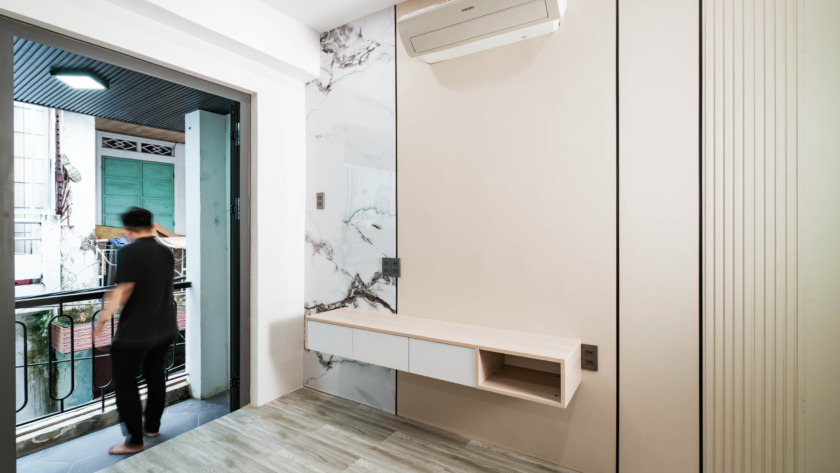 Với phần tường, Phú An sử dụng tấm ốp than tre kết hợp cùng tấm ốp PVC vân đá và tấm ốp lam sóng làm điểm nhấn. Để không gian thêm phần nổi bật, Phú An sử dụng hệ thống đèn led làm điểm nhấn cho căn phòng, tạo thêm điểm sáng giá giúp căn phòng thêm phần sáng sủa, hiện đại.