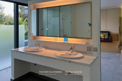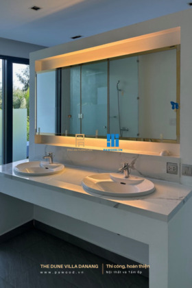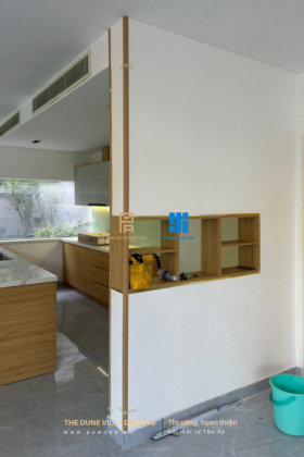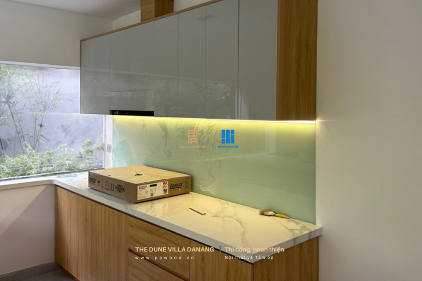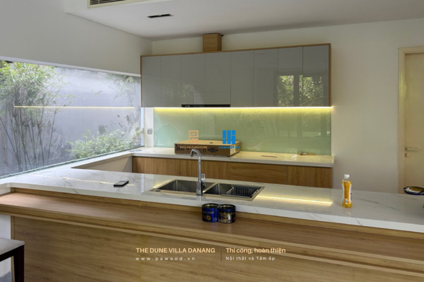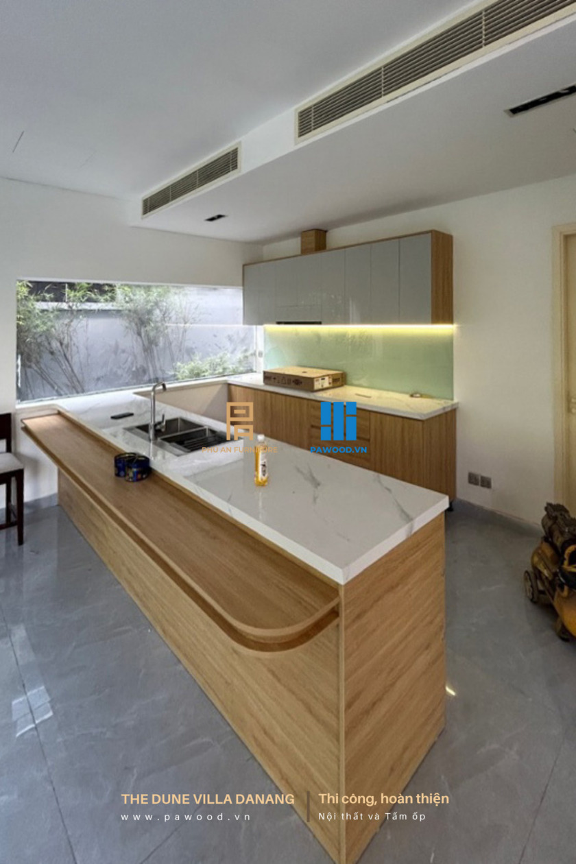 Phần bếp là một điểm nhấn lớn của nội thất villa, thấu hiểu nỗi lo của khách hàng. Phú An lựa chọn nhựa đặc nhập khẩu làm loại vật liệu chính cho phần bếp dưới. Với đặc tính chống nước tuyệt đối do làm từ nhựa nguyên sinh, đi kèm với khả năng chống chịu va đập, chịu lực cực tốt làm cho nhựa đặc trở thành loại vật liệu phù hợp nhất cho khu vực bếp dưới tiếp xúc thường xuyên với nước.