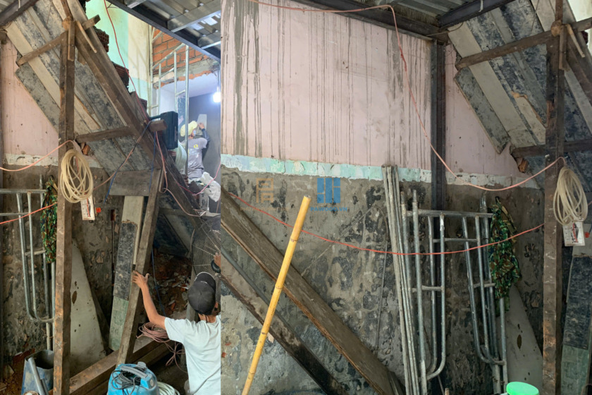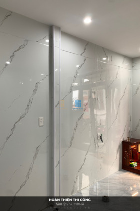 Được thi công lên tường bằng hệ thống xương thạch cao cố định bằng đinh thép. Tấm ốp PVC kết nối với hệ thống xương bằng keo chuyên dụng tạo nên một khoảng hở nhất định để giữ ẩm không cho tiếp xúc trực tiếp đến PVC. Việc thi công như vậy tránh hư hỏng vật liệu và tạo ra một bề mặt liền mạch, không có đinh cố định gây mất thẩm mỹ.