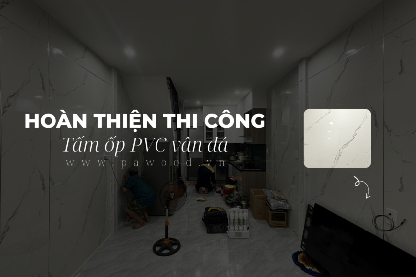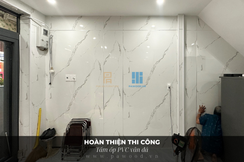 Được thi công lên tường bằng hệ thống xương thạch cao cố định bằng đinh thép. Tấm ốp PVC kết nối với hệ thống xương bằng keo chuyên dụng tạo nên một khoảng hở nhất định để giữ ẩm không cho tiếp xúc trực tiếp đến PVC. Việc thi công như vậy tránh hư hỏng vật liệu và tạo ra một bề mặt liền mạch, không có đinh cố định gây mất thẩm mỹ.