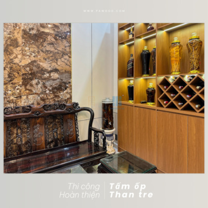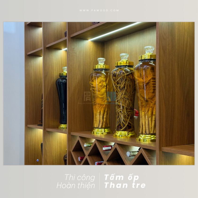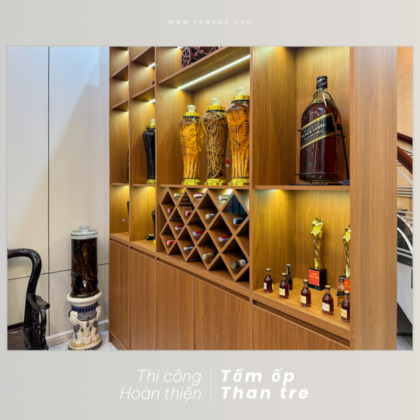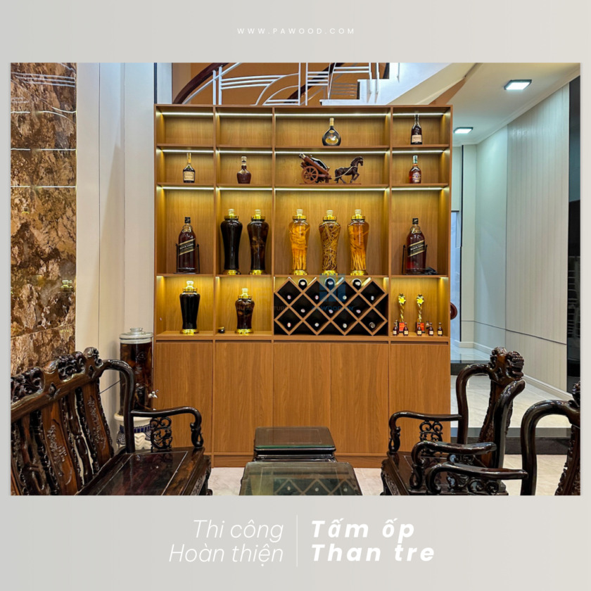 Không chỉ thi công và hoàn thiện ốp tường than tre, Phú An còn trang bị thêm cho gia chủ một tủ rượu nội thất cao cấp để tối ưu không gian trưng bày, tạo vách ngăn giữa phòng khách và khu vực cầu thang. Sử dụng vật liệu MDF nhập khẩu Thái Lan cao cấp, Phú An có thể tự tin về độ bền của sản phẩm khi đến tay khách hàng. Thiết kế đơn giản nhưng tối ưu không gian, hiệu quả cho mục đích sử dụng của gia đình.