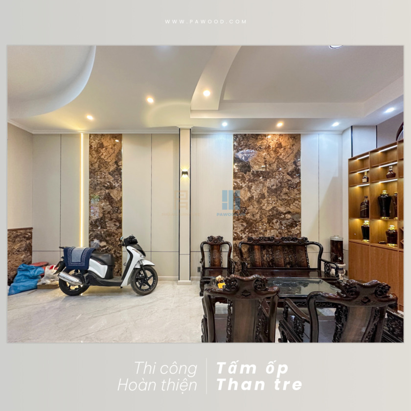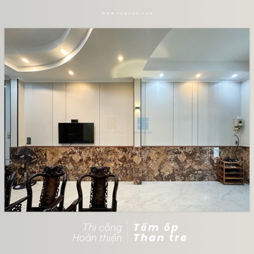Để không gian thêm phần tinh tế, Phú An đã kết hợp tấm ốp than tre với lam sóng, đá tự nhiên khổ lớn để làm điểm nhấn, tránh gây nhàm chán cho không gian sinh hoạt. Thiết kế tổng thể hài hoà với màu sắc trung tính của than tre, nổi bật với màu đá tự nhiên cao cấp tạo nên một không gian sinh hoạt chung đầy ấn tượng, sâu sắc nhưng cực kì tinh tế.