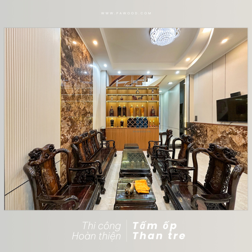 Không chỉ thi công và hoàn thiện ốp tường than tre, Phú An còn trang bị thêm cho gia chủ một tủ rượu nội thất cao cấp để tối ưu không gian trưng bày, tạo vách ngăn giữa phòng khách và khu vực cầu thang. Sử dụng vật liệu MDF nhập khẩu Thái Lan cao cấp, Phú An có thể tự tin về độ bền của sản phẩm khi đến tay khách hàng. Thiết kế đơn giản nhưng tối ưu không gian, hiệu quả cho mục đích sử dụng của gia đình.