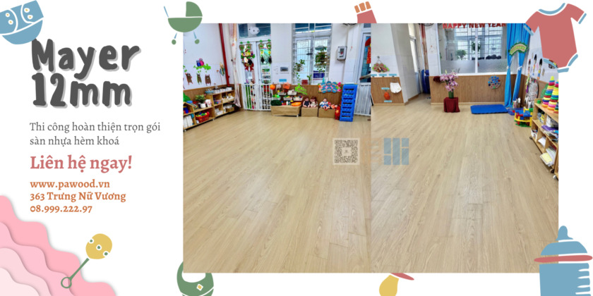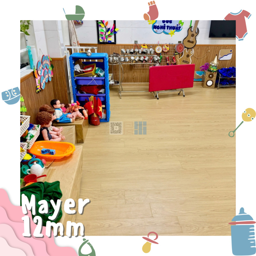 Lựa chọn vật liệu lát sàn luôn là một trong những quyết định quan trọng nhất khi hoàn thiện nội thất. Tại một trường mầm non có sàn thường xuyên tiếp xúc với nước, việc tìm kiếm một dòng sàn gỗ vừa đảm bảo tính thẩm mỹ, vừa chống chịu tốt với độ ẩm là bài toán khó. Vừa qua, chúng tôi đã hoàn thiện dự án thi công sàn gỗ Mayer Đà Nẵng cho một không gian trường, minh chứng rõ nét cho sự kết hợp hoàn hảo giữa vẻ đẹp hiện đại và độ bền vượt thời gian.
