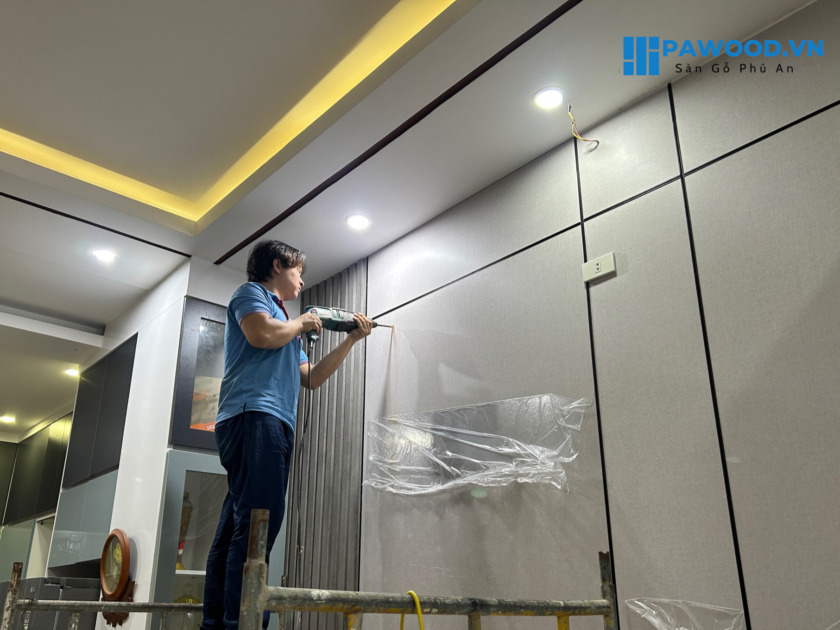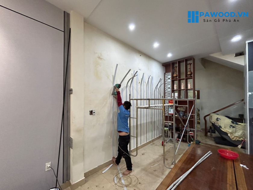 Để ngăn ngừa ẩm mốc tác động đến tấm ốp, Phú An thi công lên tường khu xương chịu lực có nhiệm vụ làm trung gian kết nối tấm ốp và tường, tạo khoảng cách hở để ẩm mốc không thể làm ảnh hưởng đến tấm ốp Than tre. Khung xương được đóng vào tường bằng đinh, sau đó tấm ốp Than tre được cố định vào khung xương bằng keo nội thất chuyên dụng siêu cứng. Do đó tạo nên khoảng cách để che đi tường ẩm, ngăn ngừa mùi ẩm mốc phát tán ra ngoài.