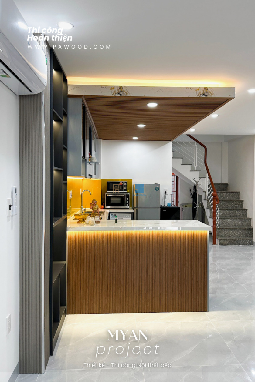 Phú An tách điệu không gian bếp Acrylic với phòng khách bằng hệ thống trần bếp được làm từ lam gỗ nhựa ngoài trời kết hợp với đèn LED viền tăng độ sáng cho không gian, tạo điểm nhấn cho căn bếp và không gian sinh hoạt chung.