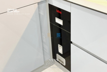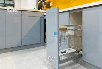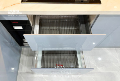 Để phục vụ đầy đủ tiện ích của một căn bếp Acrylic, Phú An bố trí hệ thống bếp chữ U vô cùng tiện lợi và rộng rãi để chị em nội trợ thoải mái nấu nướng mà không sợ bị giới hạn không gian. Với combo phụ kiện bếp chính hãng Taking và Fandi bao gồm: Chậu rửa, kệ chén bát, kệ xoong nồi, thùng gạo mặt gương, máy hút mùi và bếp từ. Phú An tin rằng combo phụ kiện sẽ giúp tiết kiệm khá nhiều thời gian và chi phú cho quý khách.