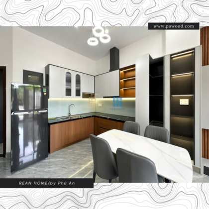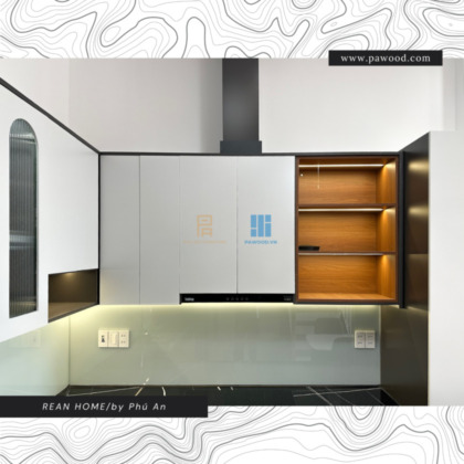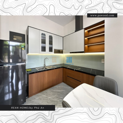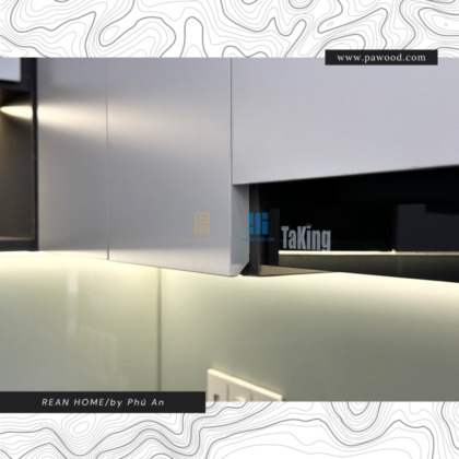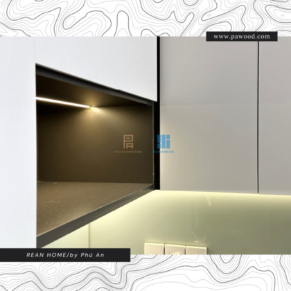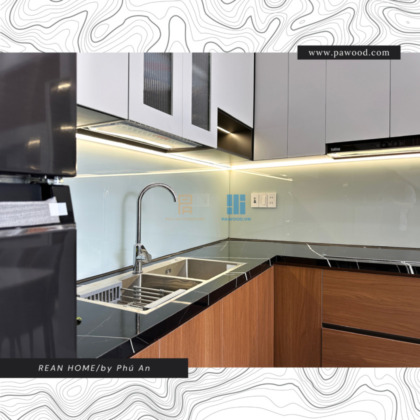 Với thùng bếp chịu ẩm, Phú An sử dụng thùng nhựa đặc cao cấp cho dự án thi công trọn gói cho Rean House. Với cánh tủ bề mặt nhám, loại vật liệu được chúng tôi lựa chọn là Laminate cao cấp với đa dạng màu vân, màu sắc hài hoà và bề mặt láng mịn cực kì thích mắt.
