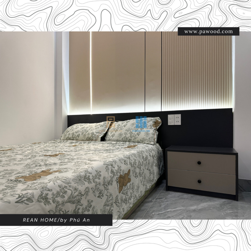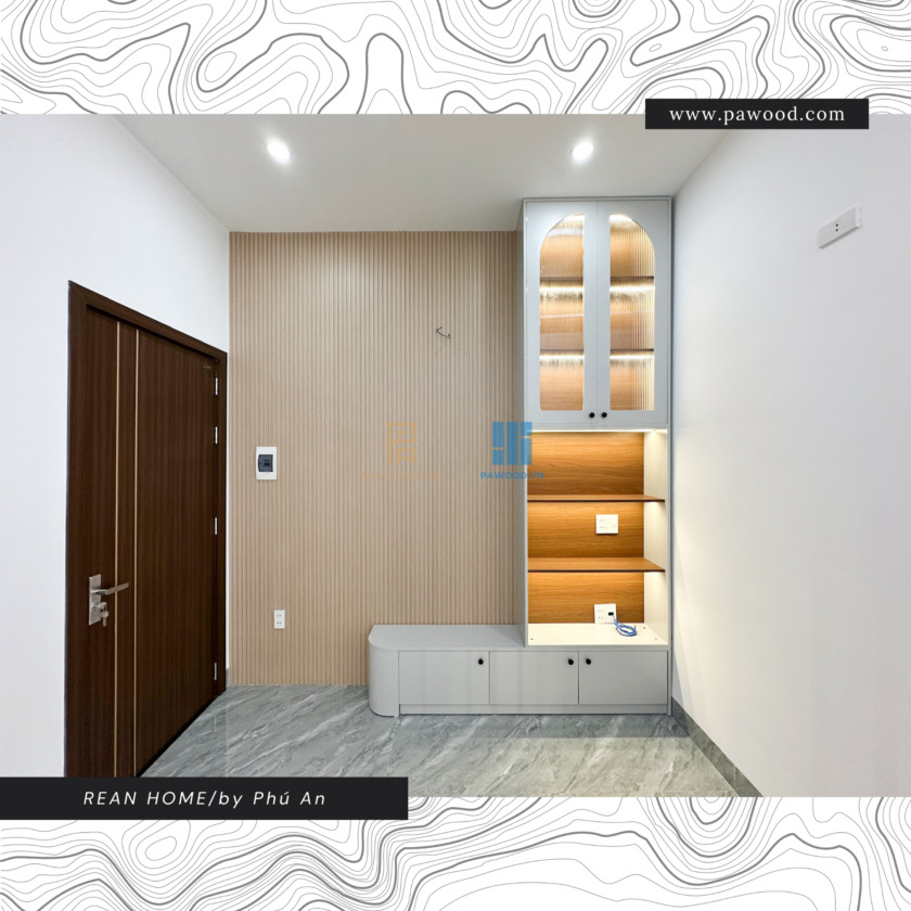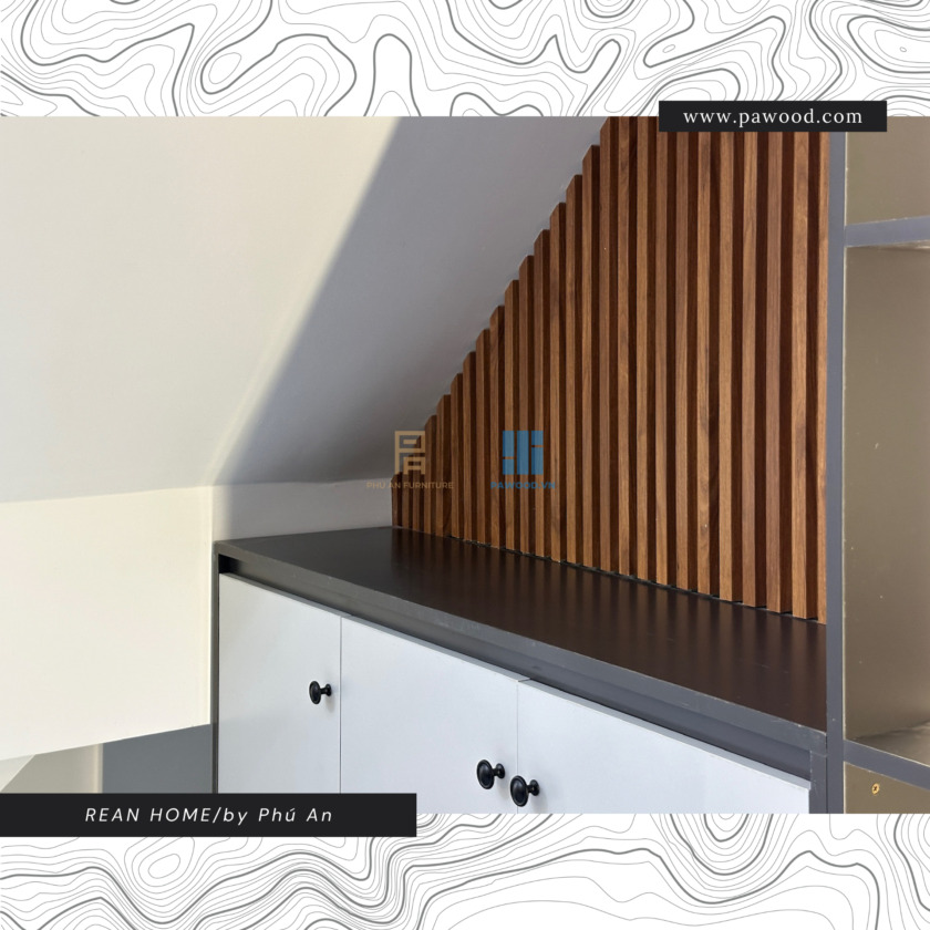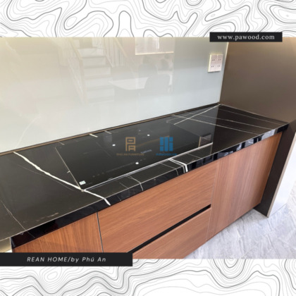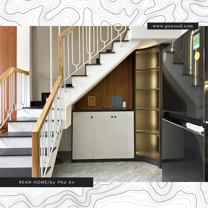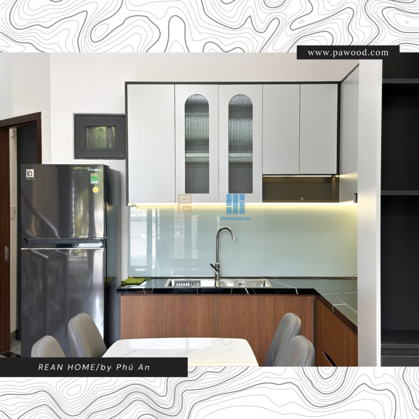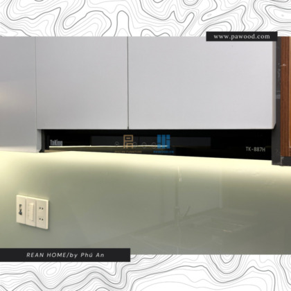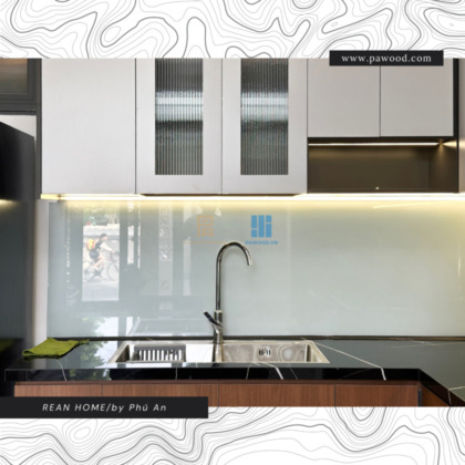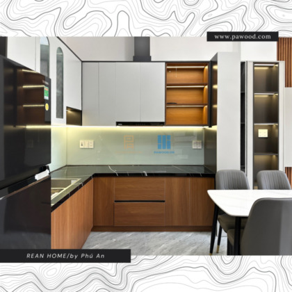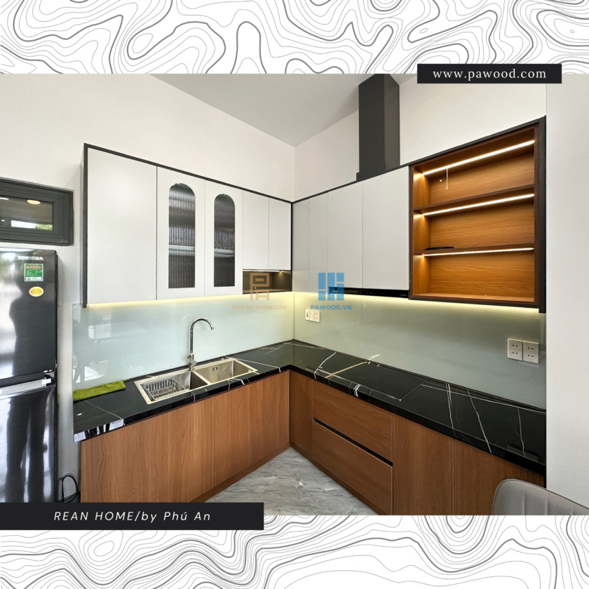 Với thùng bếp chịu ẩm, Phú An sử dụng thùng nhựa đặc cao cấp cho dự án thi công trọn gói cho Rean House. Với cánh tủ bề mặt nhám, loại vật liệu được chúng tôi lựa chọn là Laminate cao cấp với đa dạng màu vân, màu sắc hài hoà và bề mặt láng mịn cực kì thích mắt.