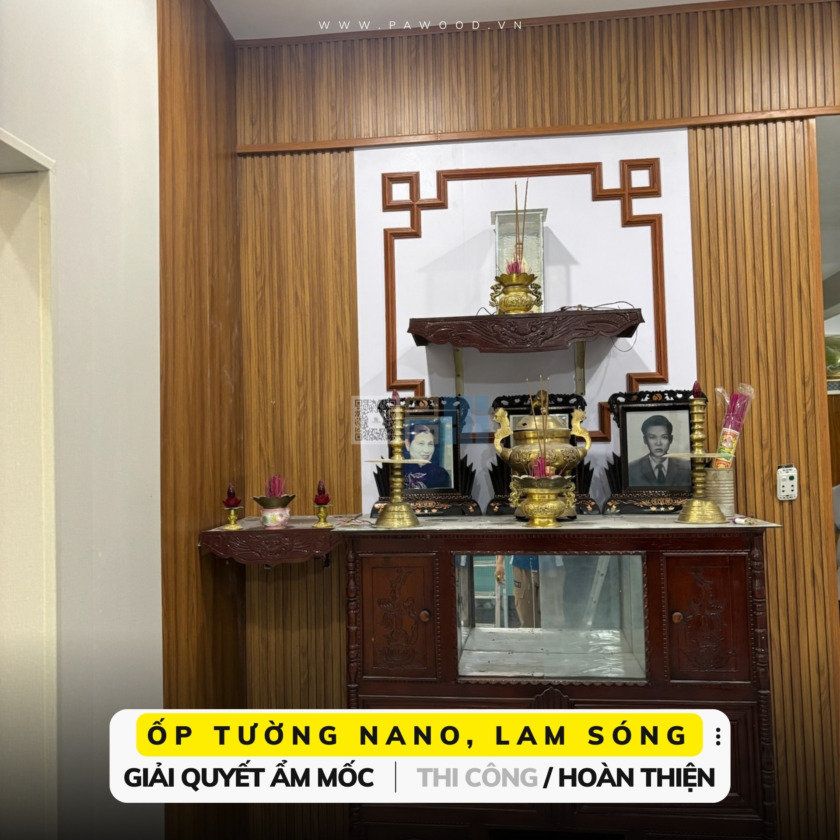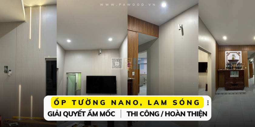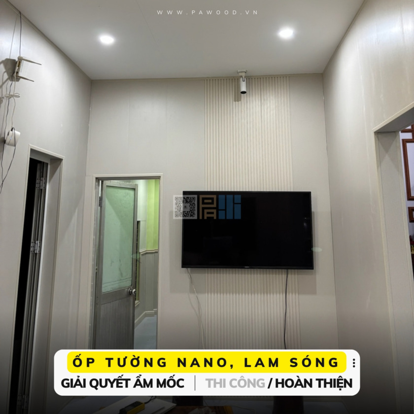 Tấm ốp nhựa Nano (Phẳng): Đây là vật liệu xương sống của công trình. Với cấu tạo từ nhựa nguyên sinh, tấm Nano miễn nhiễm hoàn toàn với nước và mối mọt. Chúng tôi sử dụng tấm Nano vân gỗ sáng màu để ốp các diện tường lớn, tạo nền nã và cảm giác không gian được mở rộng.