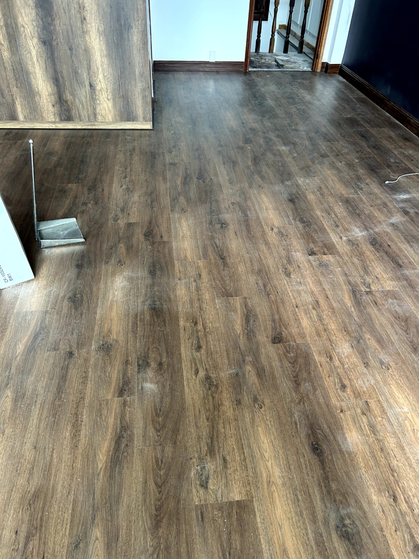 Sử dụng chổi mềm hoặc máy hút bụi để làm sạch bụi bẩn trên sàn, kết hợp lau bằng khăn ẩm nhẹ để loại bỏ vết bẩn.