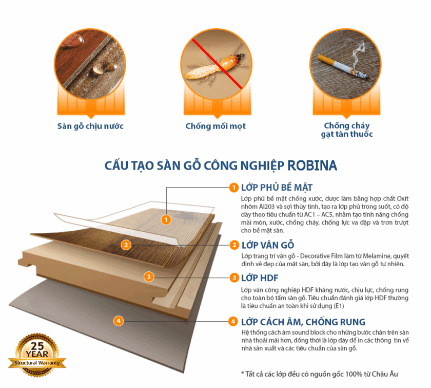 Với nhà máy đạt chuẩn sản phẩm đầu ra có chất lượng Châu Âu, sàn gỗ Robina mang đến thị trường một dòng sàn gỗ HDF chất lượng, phù hợp với đặc điểm khí hậu Việt Nam. Với công nghệ sản xuất sàn HDF tiên tiến giúp cho sàn có các đặc tính nổi bật như chống nước, chống mối mọt, chống cháy,…